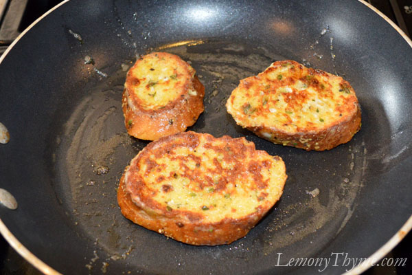- Melt butter in a skillet over medium-low heat. Pan grill bread slices on each side until golden brown and not soggy to the touch.