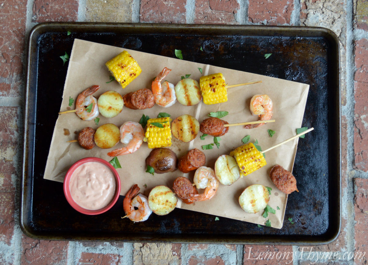 Once the ingredients were done, I allowed them to cool slightly so I could assemble them on skewers. One of the nice things about the skewers is you could assemble them ahead of time and then as we did, flash grill them on each side for a minute or so before serving. If you’re like me and thought Low-Country Boils were reserved for big crowds….think again. We just had a two person party that was mighty tasty (and cleanup was a breeze).