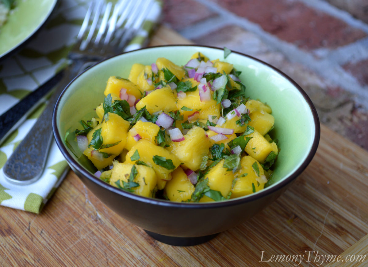 For this salsa, basic ingredients come together so nicely when fresh herbs have a chance to join in. I love cilantro and mint together and any time fruit is involved I invite lemony thyme to the party. A basic rice vinegar and sugar dressing is all that’s needed. We served this Mango Salsa with Grilled Vietnamese Chicken Thighs. It would also be fabulous served with tortilla chips.