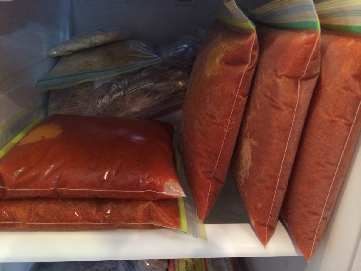 Once cooled transfer Marinara Sauce to a quart-sized zip top bag and freeze flat. As long as there continues to be tomatoes at the Farmers Market, I’ll continue to bring home baskets full. About that homesteader thing….last night I made loaves of homemade white bread from scratch. Yes, my kneading skills need a little practice, but it looked and tasted like bread. Can’t believe I waited this long.