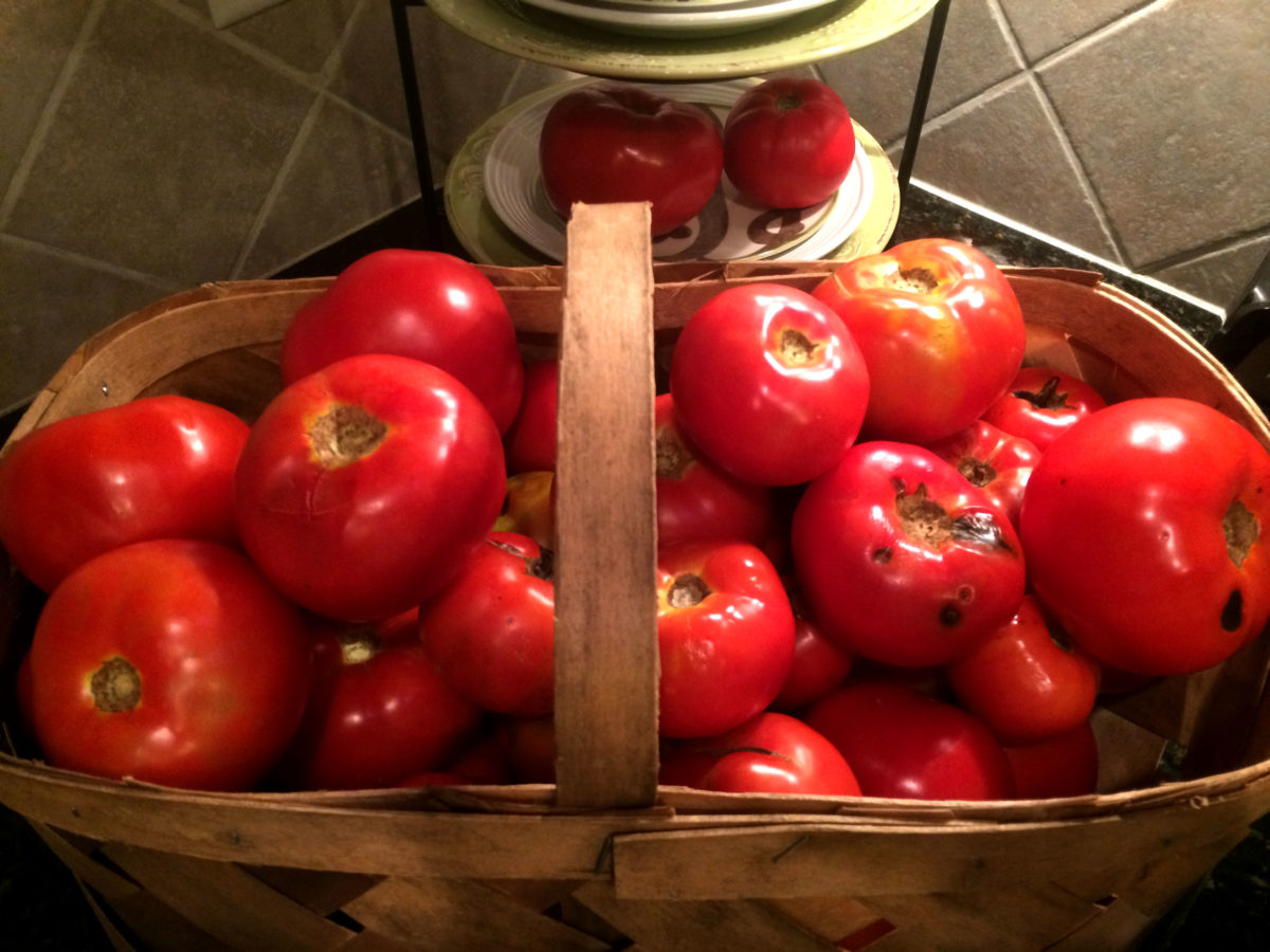 After making about 10 batches of Marinara Sauce I felt confident enough to share our recipe. We begin with about 4 pounds of ‘ugly’ tomatoes. The sign at the Farmers Market said ‘soup tomatoes’ indicating the random black spots weren’t presentation quality. These tomatoes may not be the prettiest, but this 20+ pound basket only cost $10. We’ll get 4 batches of sauce out of them, which is much less expensive than what we’d been spending on our favorite Rao’s Sauce. I bought two huge baskets last week and B got busy turning these tomatoes into sauce.