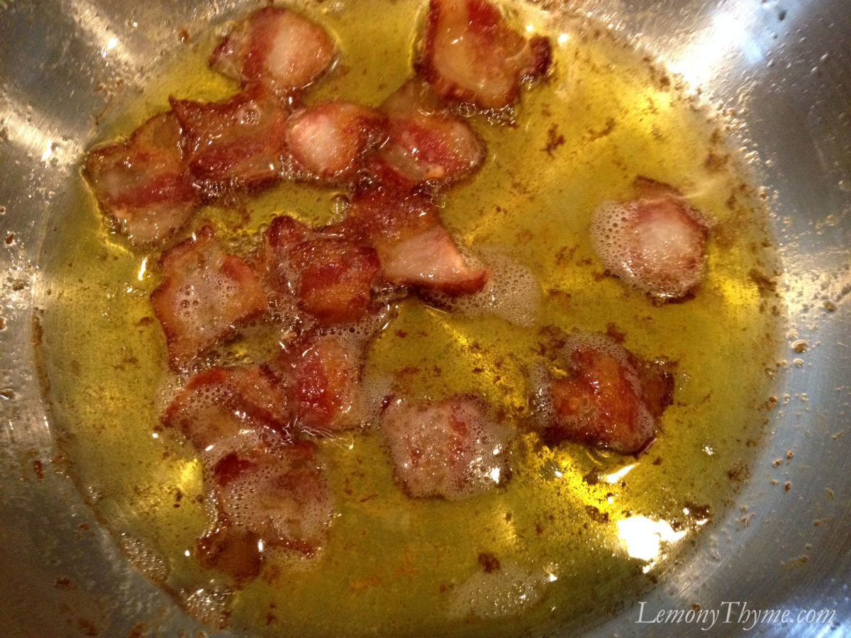 Meanwhile in a large saucepan, cook your bacon in the olive oil. That’s right, sounds like overkill but that bacon influence brings an unmistakable richness to the sauce. Once the bacon is cooked to your liking, remove it from the olive oil and have yourself a snack.