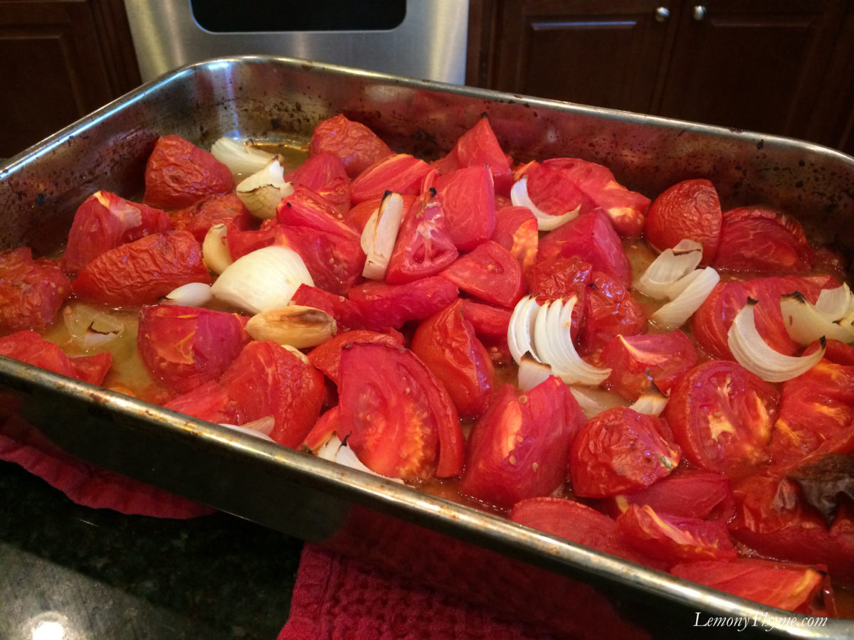 Break out your biggest roasting pan. Rough chop an onion, throw in a few garlic cloves, then load it up with chunks of tomatoes (cores and black spots removed). Drizzle it with a little olive oil and into the oven they go.