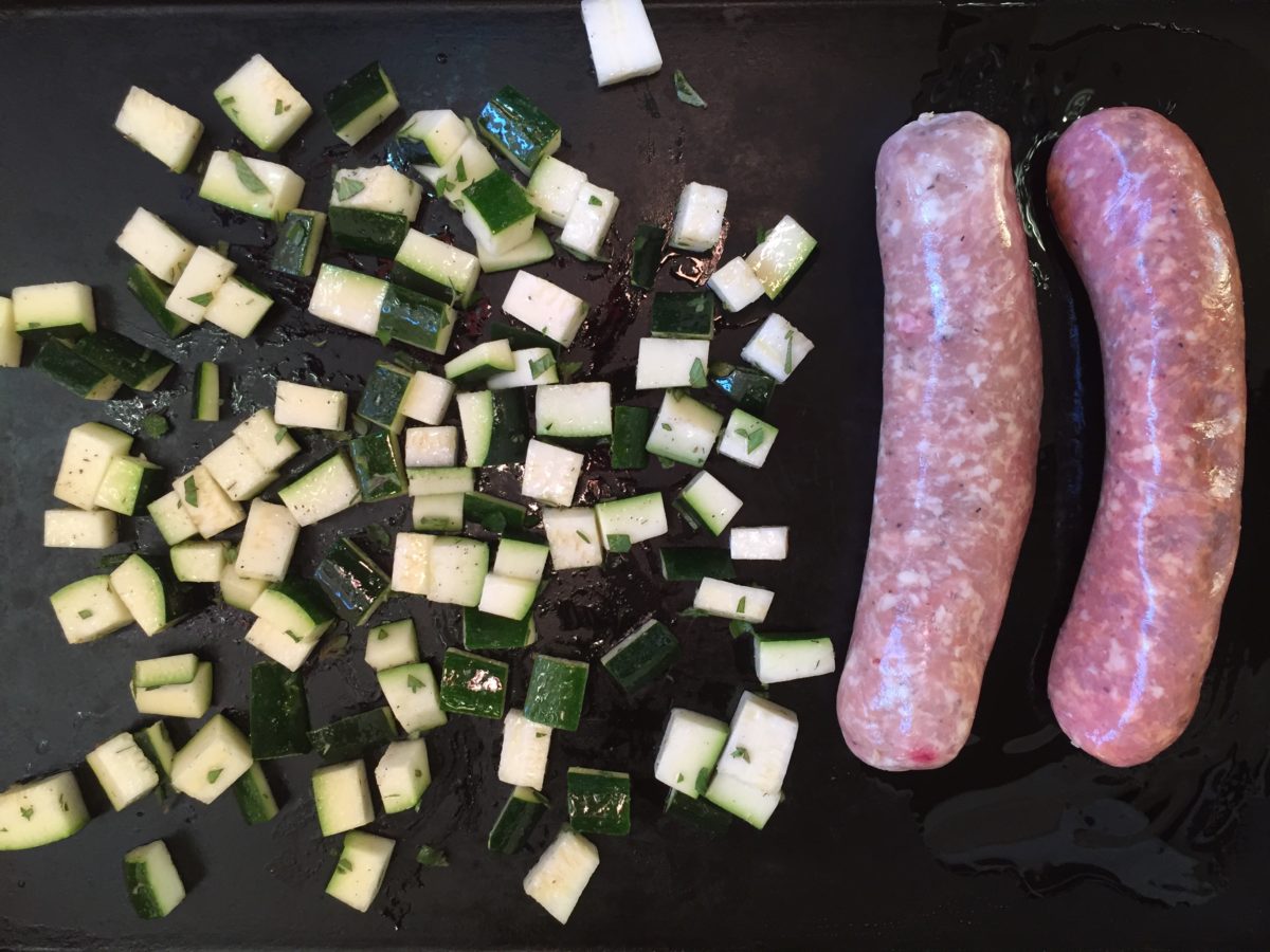 - Toss zucchini with olive oil, oregano, and salt & pepper. Spread in a single layer on a baking sheet, along with sausages. Roast, tossing once, until golden brown, about 25 minutes.