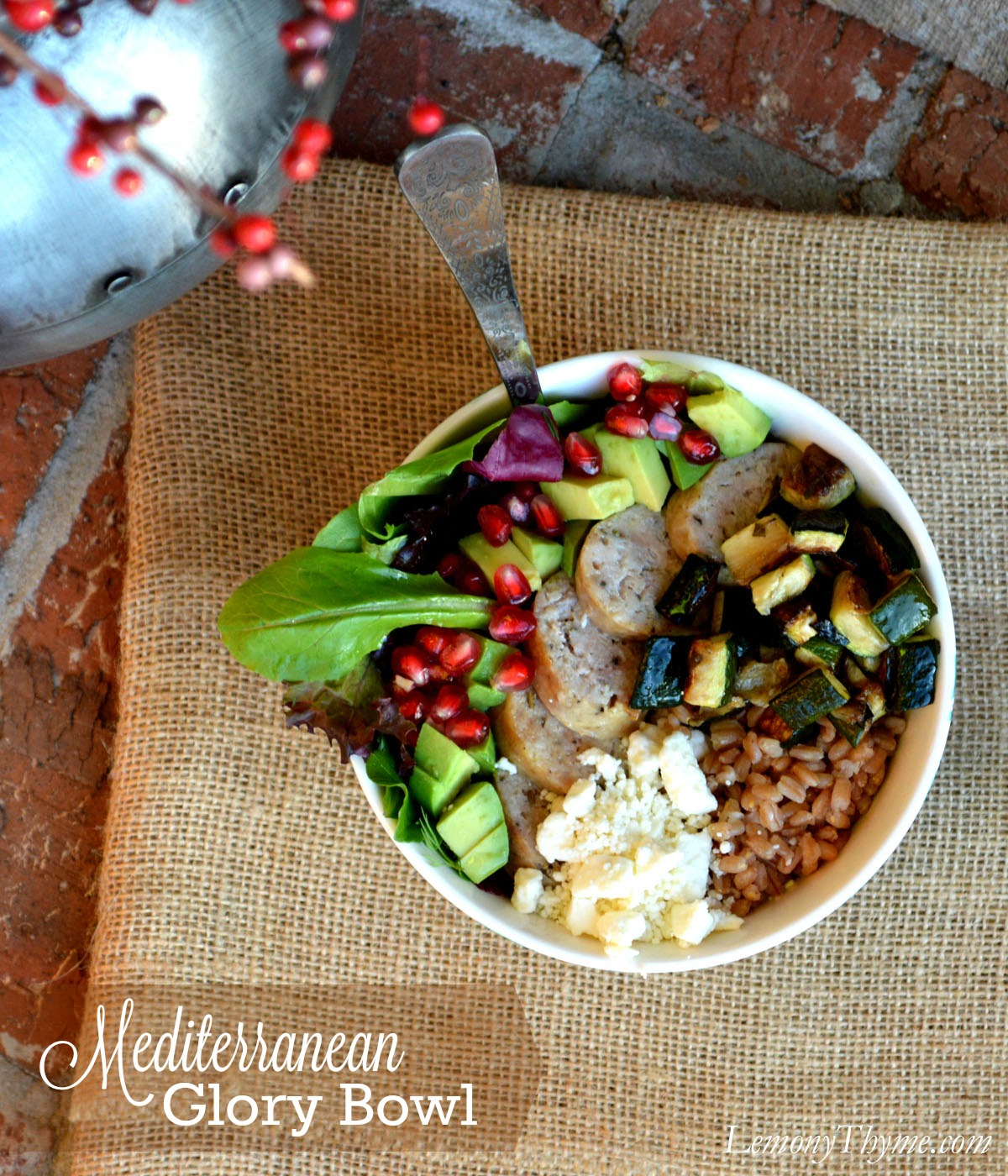 Mediterranean Glory Bowl combines health benefits with flavorful roasted zucchini, pomegranate, avocado, feta, chicken sausage, and lime juice.