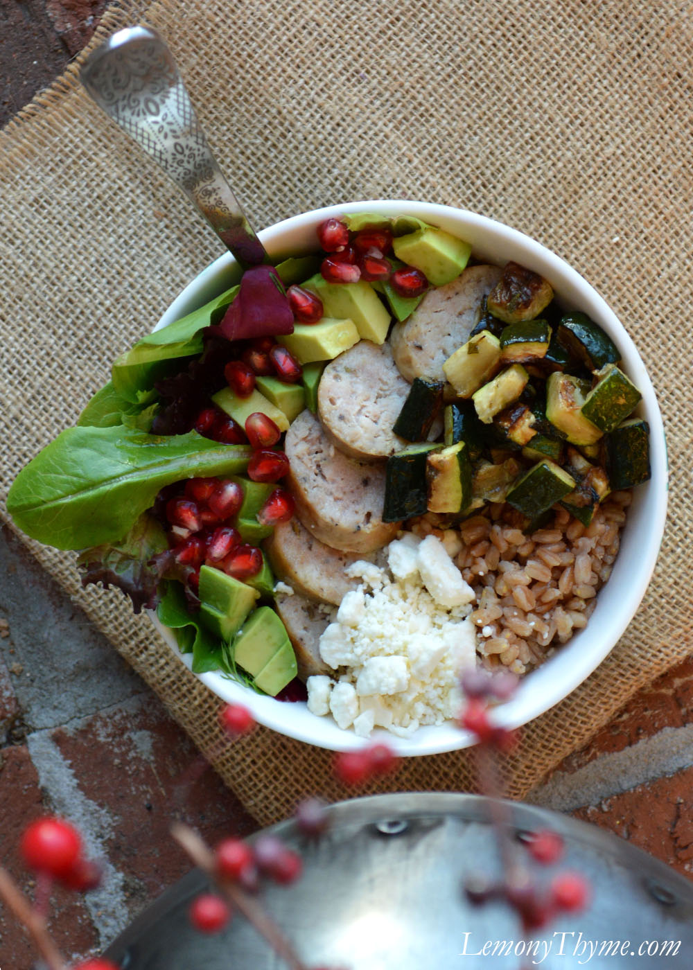 I have a favorite holiday dip/salsa recipe that I prepare every year. Pomegranate, Zuchinni & Avocado Salsa is Mediterranean flavor love…in it’s GLORY. Thus the name of this Lunch Bowl. I added sweat Italian chicken sausage and farro for a burst of protein.