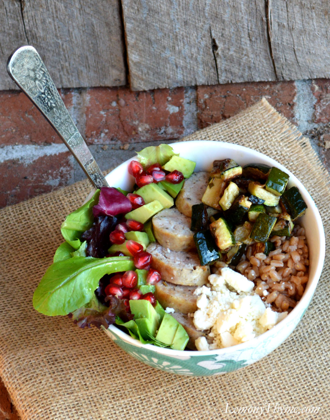 - To prepare bowl make a bed of salad greens and cooked farro. Add a spoonful of each remaining ingredient, including sliced sausage. Squeeze lime juice over top.