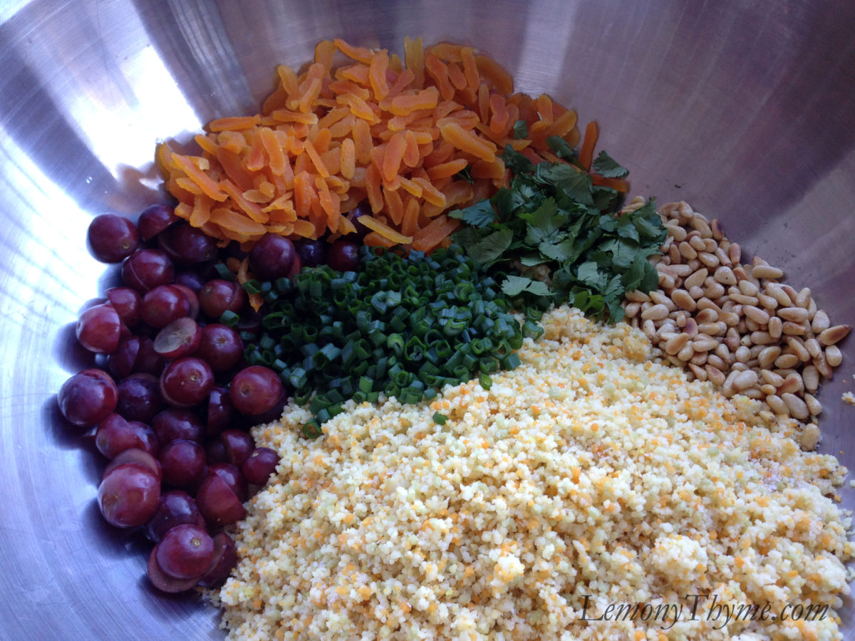 I prepared the couscous and once cooled tossed it with sweet seedless red grapes, dried apricots, toasted pine nuts, scallions and fresh cilantro, then drizzled the salad with an apricot lemon dressing (Eureka Lemon EVOO, apricot preserves, white balsamic vinegar, sriracha, lemon juice & zest, toasted ground cumin seeds, coriander, and a pinch of cinnamon). This Moroccan Couscous Salad had the right balance of sweet and tart, with the subtle flavors of spice shining through. Spectacular.