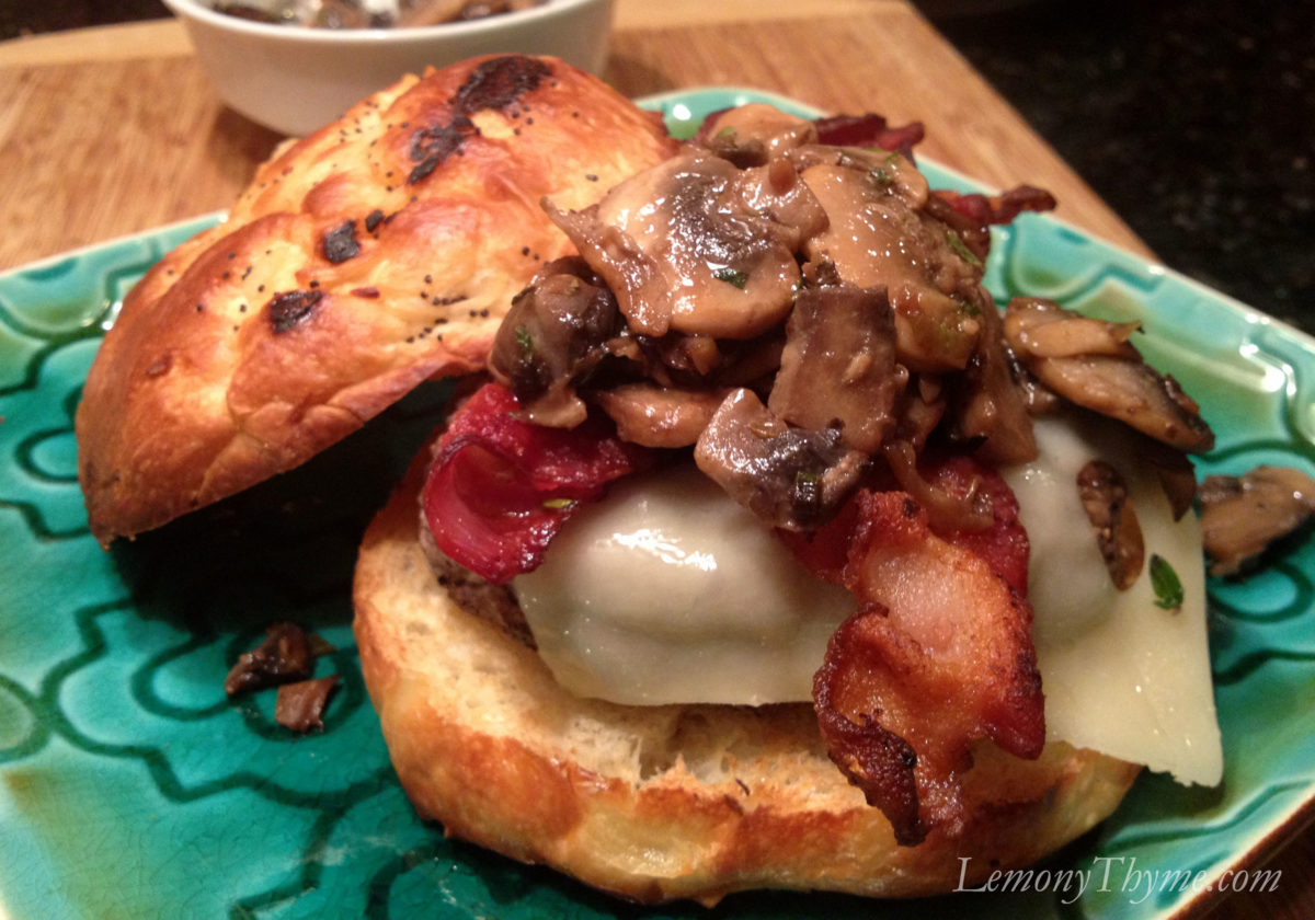 Is there anything better than a good burger? Okay yes… there are some things, but on the rare occasion that we actually make beef burgers (vs. turkey or salmon) they are such a huge treat. Whether you lay them on a bed of greens or perched on a toasted onion roll they are amazing. Top them with a slice of nutty pungent Swiss cheese, sautéed mushrooms, and a couple of strips of crispy bacon…. Mushroom Bacon Swiss Burgers = WINNING!!