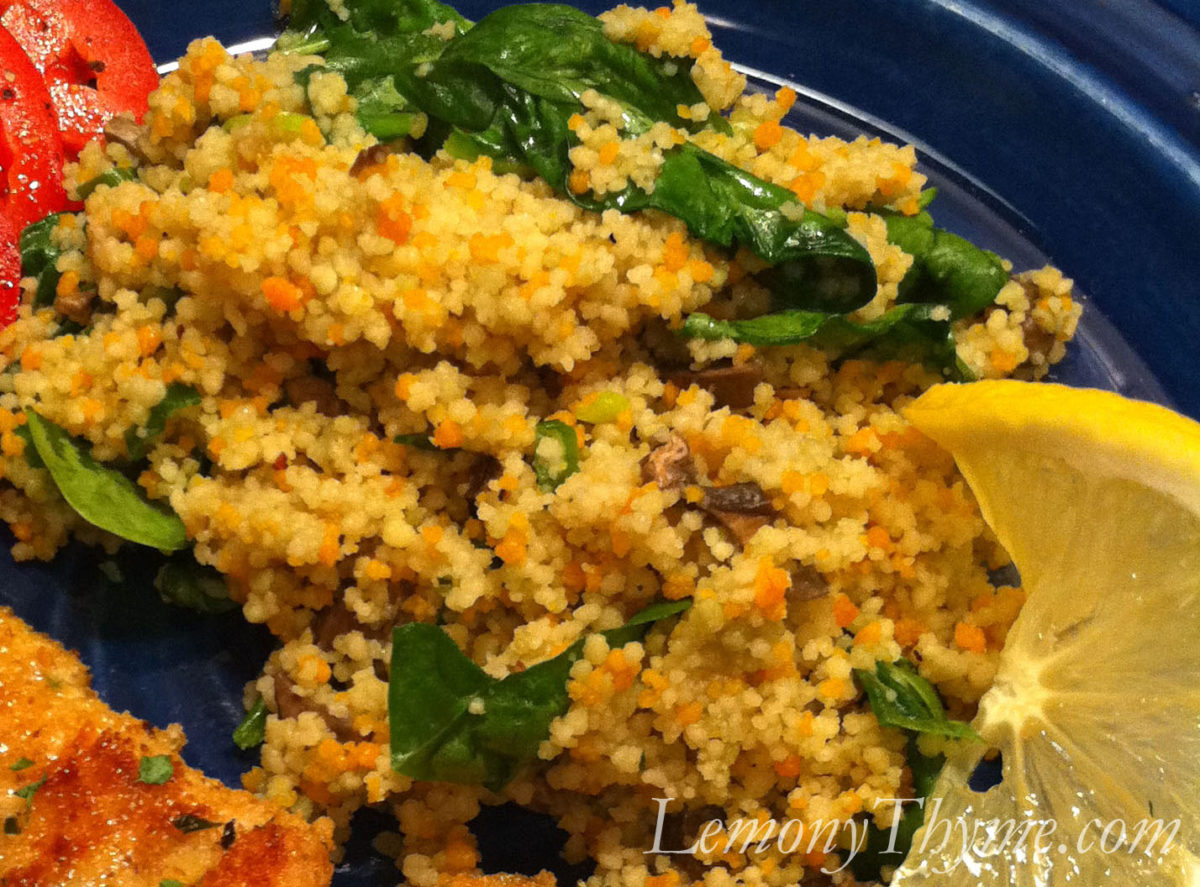 I am a huge fan of couscous and an even bigger fan of changing it up each time we make it. For Mushroom, Spinach & Herb Couscous, I add diced fresh mushrooms, and sliced scallions to the cooking water, along with a tablespoon of olive oil, a teaspoon of fine chopped fresh lemony thyme, and about a 1/2 teaspoon of Mrs. Dash Garlic & Herb seasoning.