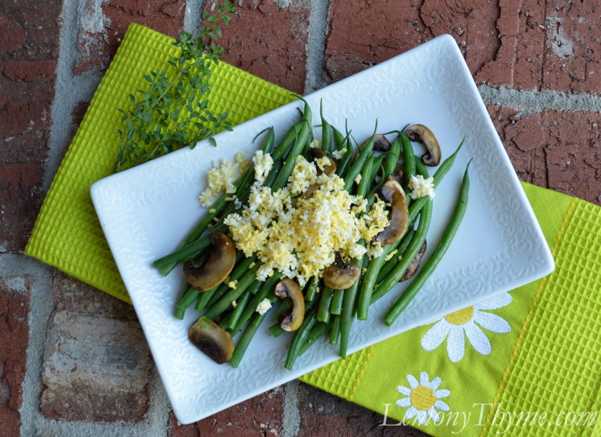 For this simple recipe I steamed the beans then tossed them with sautéed mushrooms and thyme. A drizzle of good quality olive oil and fresh grated hard-boiled egg finished the dish. I did say ‘grated’ but I actually pressed the egg through a fine mesh sieve to get a nice fluffy pile of ‘grated’ egg. Which makes a wonderful topping for veggies, seafood, and salads.