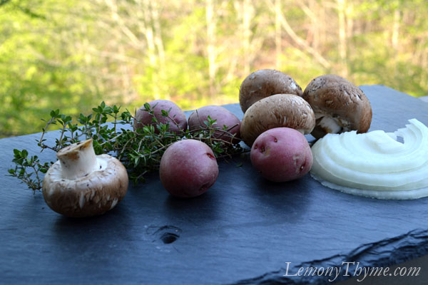 Other than to serve it up. We wanted mushrooms to be the star, and where there are mushrooms there should also be thyme. Sliced baby red potatoes and thinly sliced onion assumed their role as ‘another veggie’. Tossed in olive oil and oven roasted until almost crispy. I had to slap hands away from these….who needs potato chips?!!