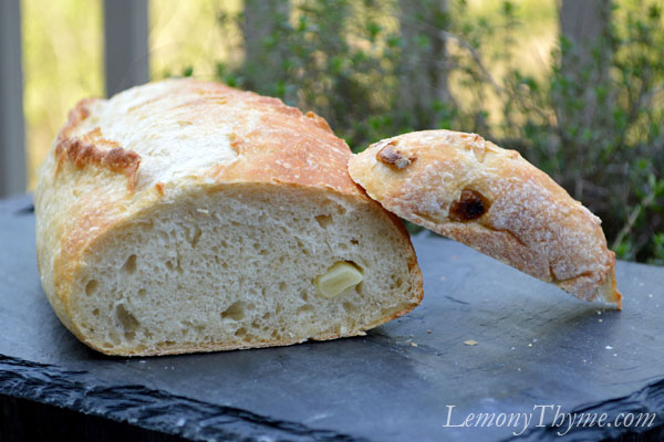I gave good consideration to what kind of bread would compliment the well selected ingredients of our Mushroom & Thyme Truffled Grilled Cheese Sandwich. Tuscan Garlic Bread nearly jumped out of the bakery case. When I sliced it and found whole garlic cloves I promise I heard the sound of harps playing in the distance.
