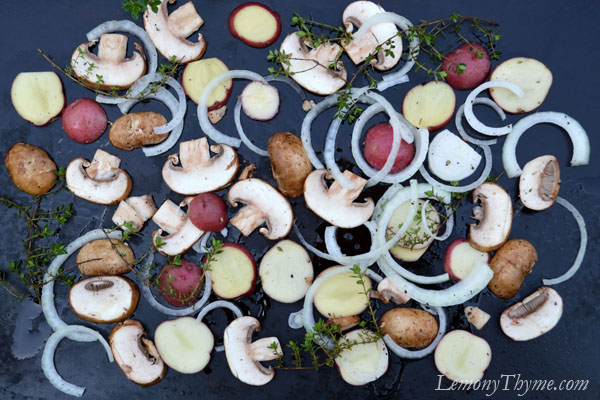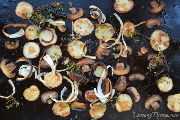 - Preheat oven to 375 degrees. Toss mushrooms, potatoes, onion, and thyme in olive oil, salt & pepper. Spread in a single layer on a baking sheet. Bake for 10 minutes, turn mushrooms and potatoes and bake another 5 minutes or until golden and slightly crispy.