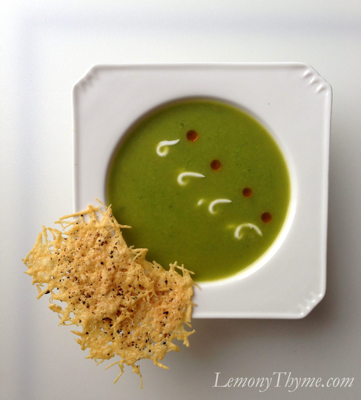 Sweet Pea & Parmesan Soup with Parmesan Crisps, Greek Yogurt, and Paprika Oil.