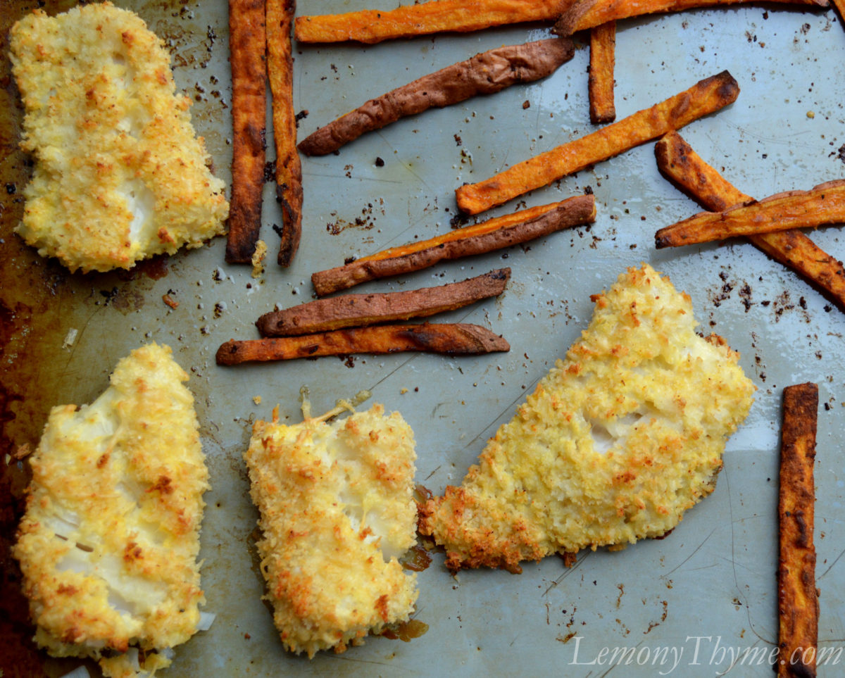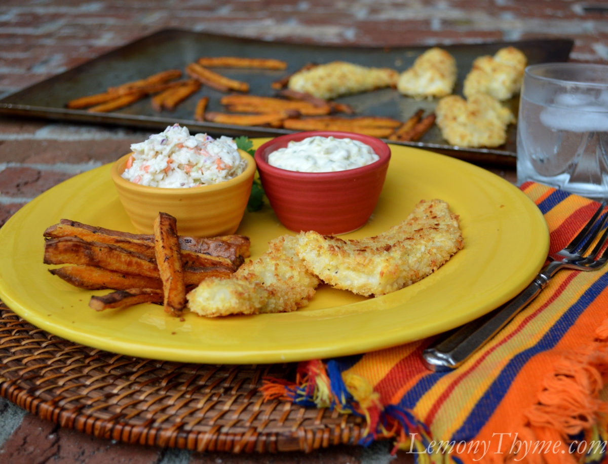 I can generally count on fresh cod being available at my local seafood counter. Cod is the perfect mild white flaky fish to turn into fish sticks. I cut the fillet into pieces and dipped them in egg white before encrusting them with a seasoned panko parmesan coating. I baked them along side my fries, in this case Sweet Potato Fries, until they were both crispy and golden brown. Served with a side of Tartar Sauce and Coleslaw and dinner is done. Yum!
