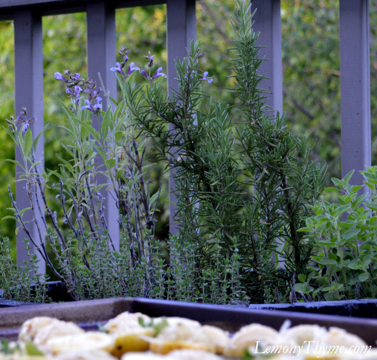 We used ‘petite‘ potatoes (tiny Idaho or Yukon Gold both worked well…remember we ate these 4 days straight), sliced in half.  We coated them with a generous amount of Wild Mushroom & Sage Olive Oil (or you can use your favorite EVOO).  Then we tossed in a couple handfuls of fresh herbs.  For us that meant the ones that came back from last year….Rosemary, Thyme, and their sister Sage.