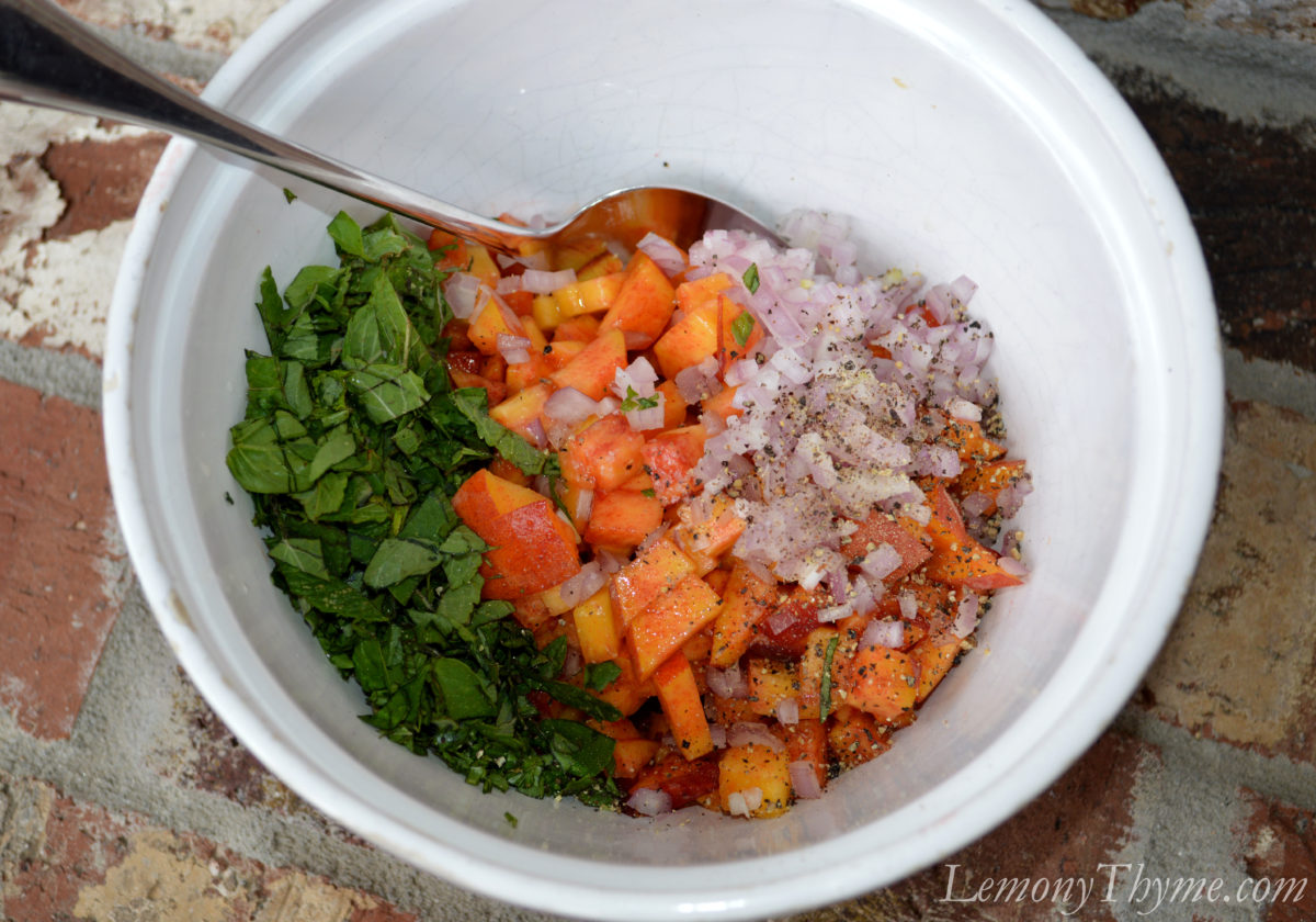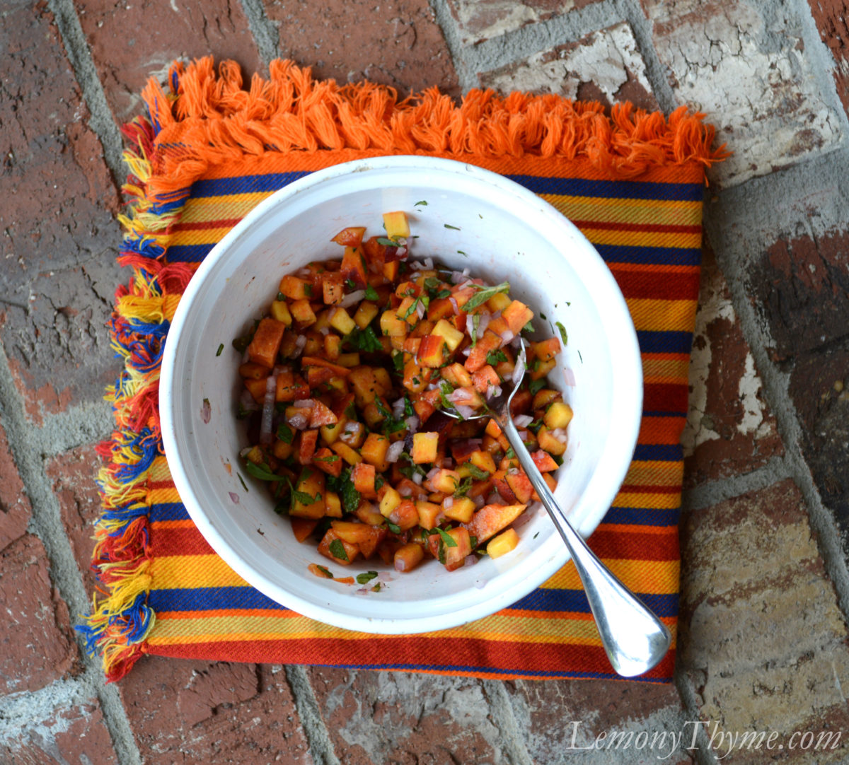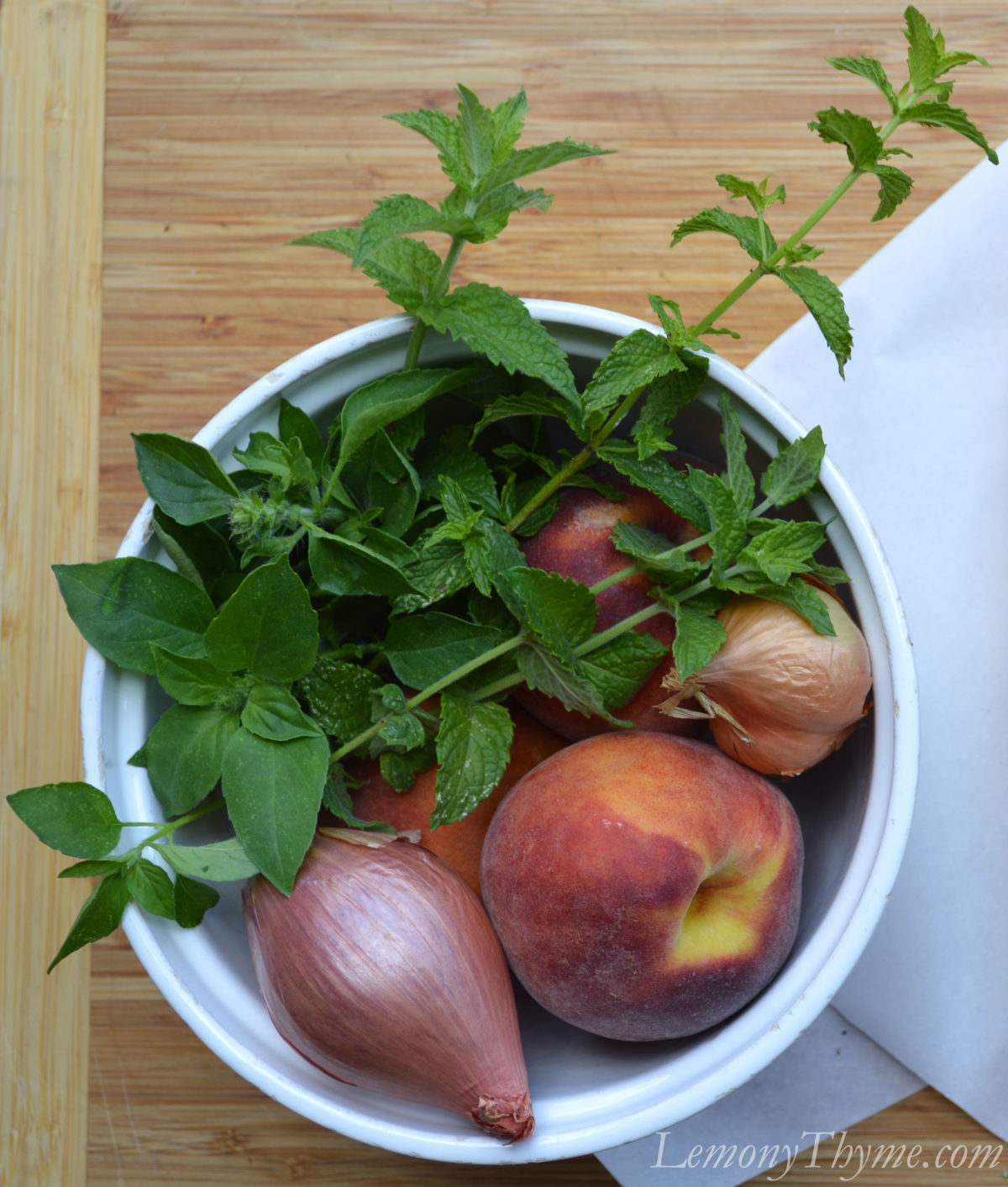 Fresh juicy summer peaches bring a sweet-tart happiness to this relish. Finely diced shallot and lots of fresh basil and mint add balance. A little lemon juice and agave nectar encourage the ingredients to dance. Right into my mouth.