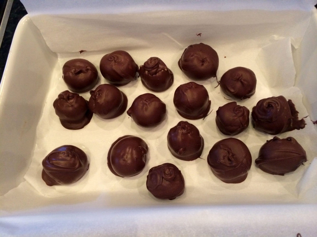 You’ll want to keep the peanut butter balls as cold as possible for dipping. I kept them in the freezer, dipping 2-3 at a time.
