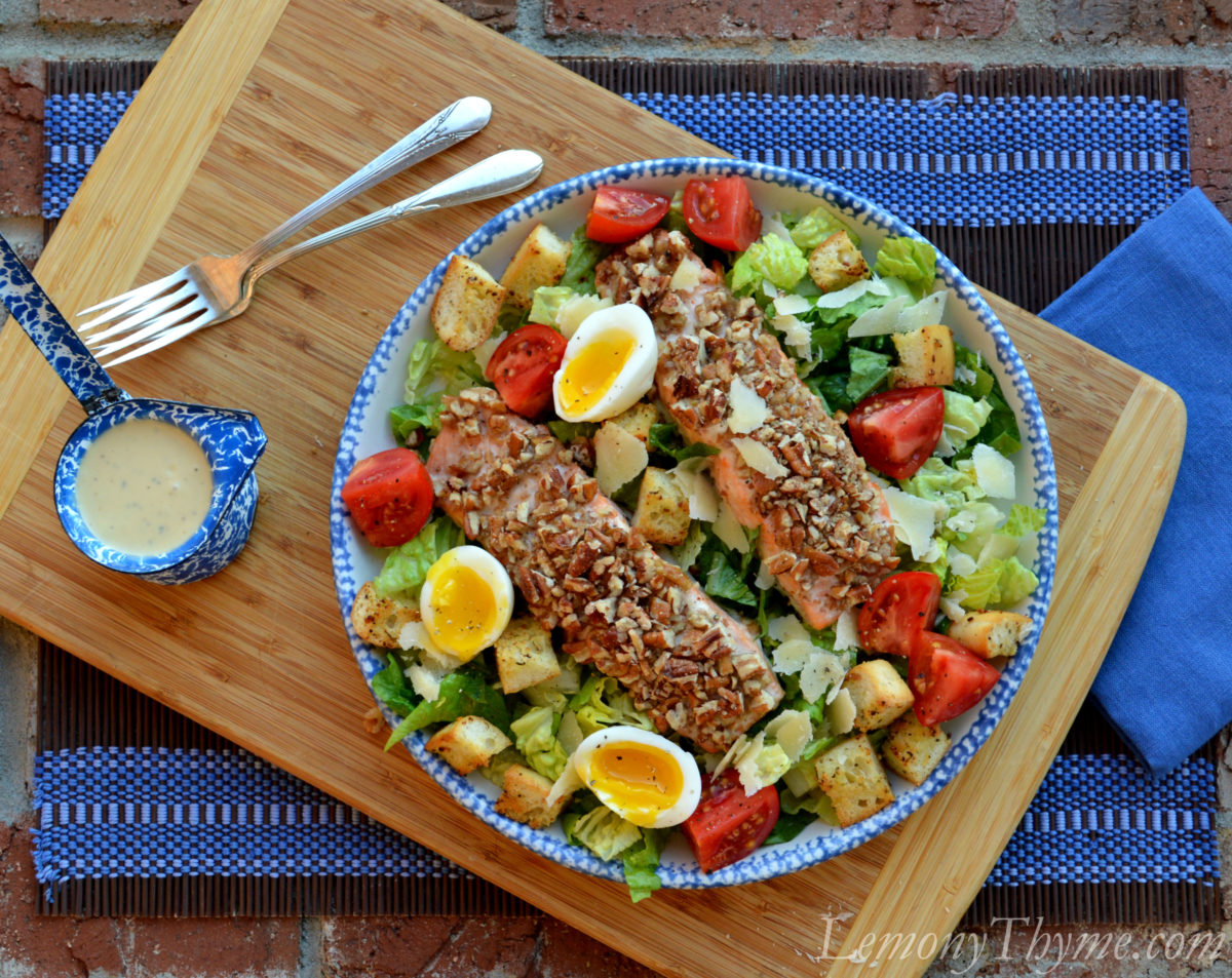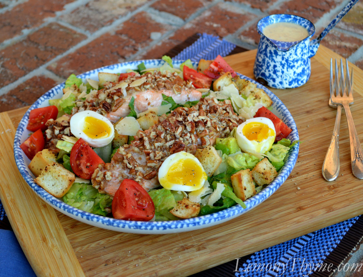 Simple fresh ingredients that come together with ease. Glorious maple pecan encrusted salmon over a bed of crisp romaine with hard boiled eggs, fresh tomatoes, homemade croutons and shaved Parmesan cheese. As delicious as you could find in a restaurant, enjoyed in the comfort of home.