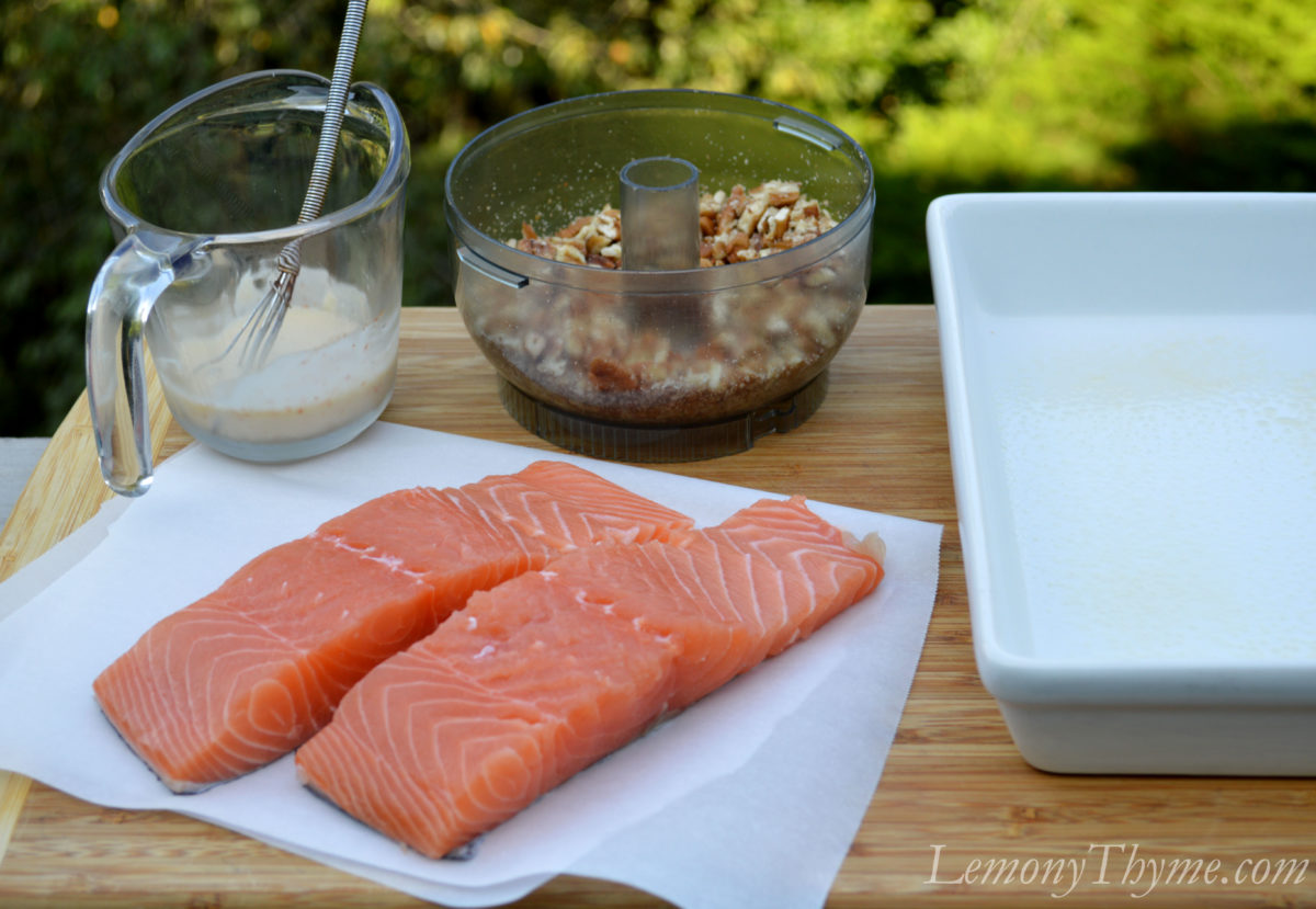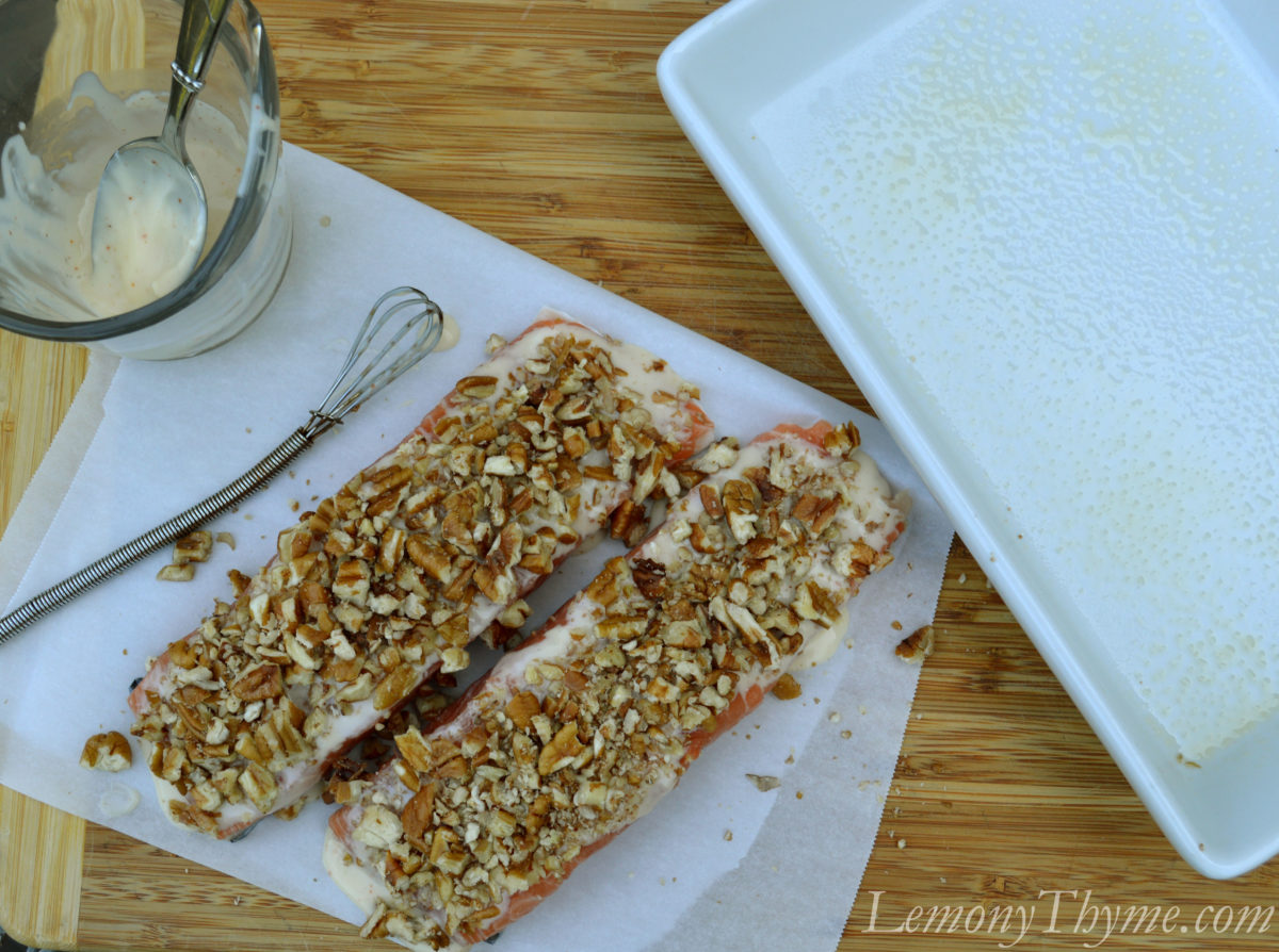 Jump to RecipeWe coat the flesh sides of the salmon pieces with a little mayo, maple syrup, cayenne dressing, then press chopped pecans on top.