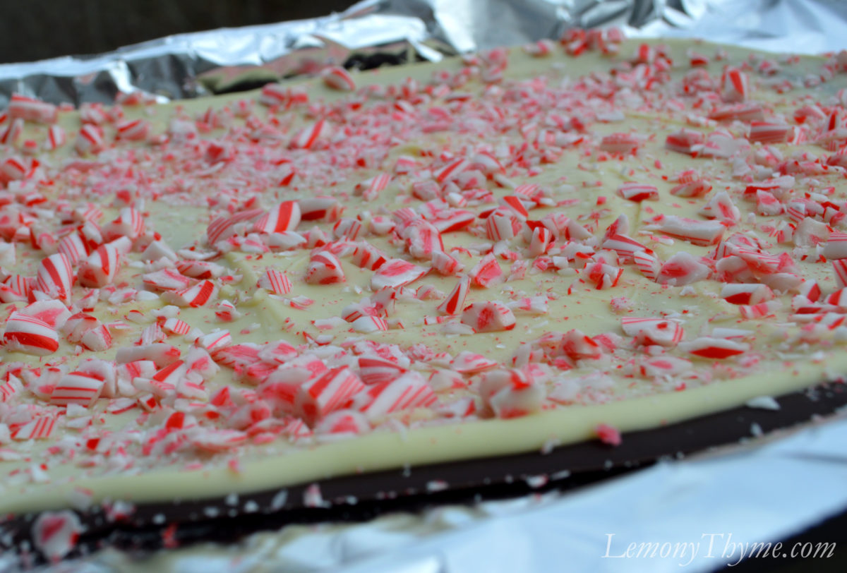 - Sprinkle crushed candy canes over white chocolate pressing in gently. Chill. Break. Enjoy.