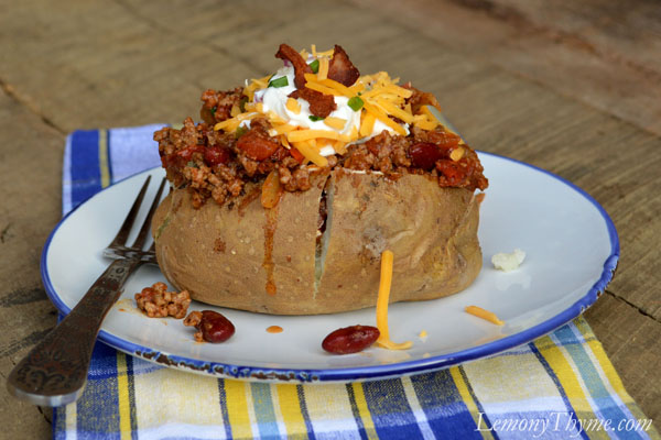 Chili & Cheese Topped Baked Potato {with Sour Cream and Bacon}.