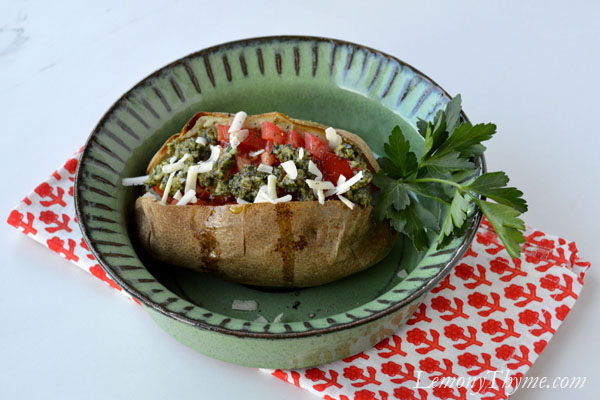 Baked Potato {with Tomatoes, Basil Pesto & Fresh Mozzarella}.