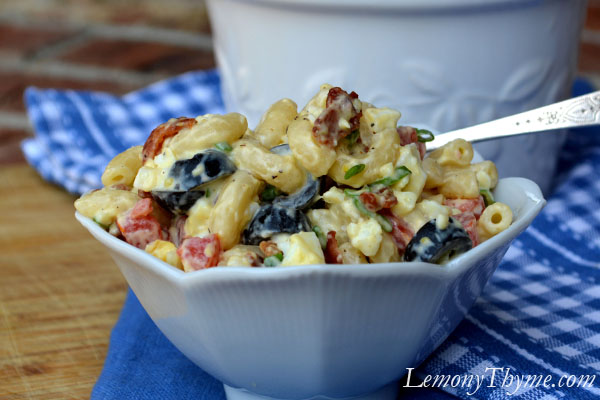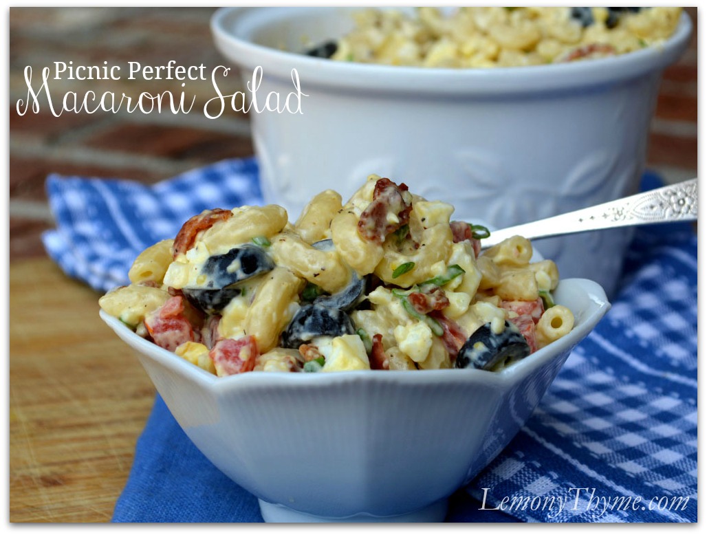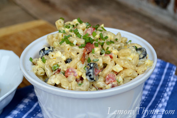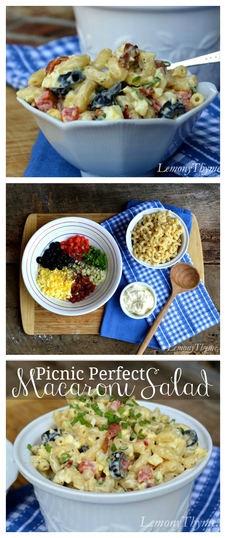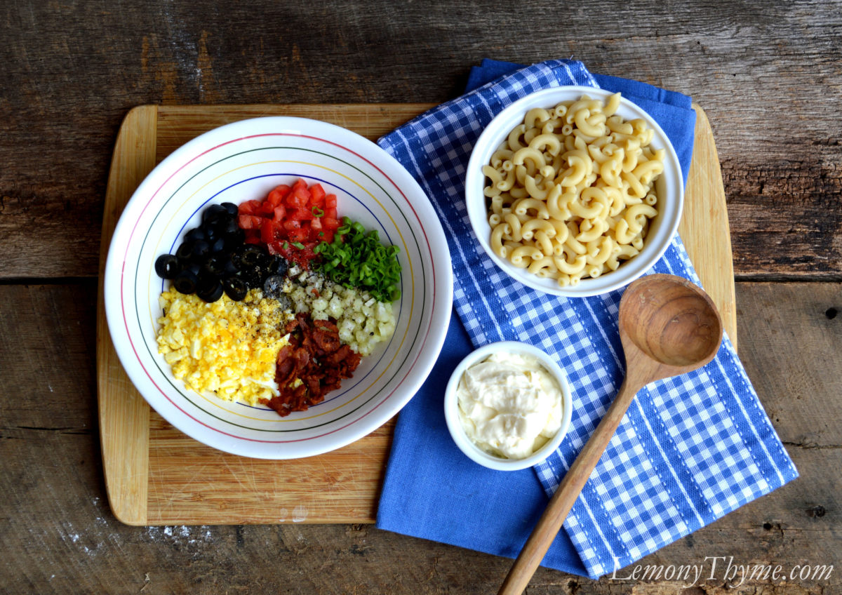 Elbow macaroni and mayonnaise is where we start. For my Picnic Perfect Macaroni Salad I like to add hard boiled eggs, crispy bacon, diced tomato, celery, scallions, and black olives. This gives a nice variety of color and crunch and the flavors all play nicely together.