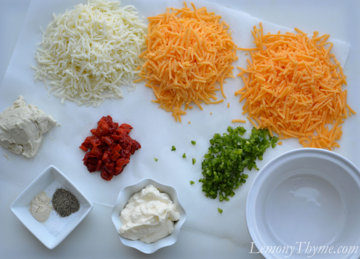 Here are my ingredients. You’ll notice the cheese is the store bought shredded kind and that is on purpose. Freshly shredded cheese is soft and while that’s wonderful for most everything, we like our Pimento Cheese Dip to keep it’s texture and flavor personality.