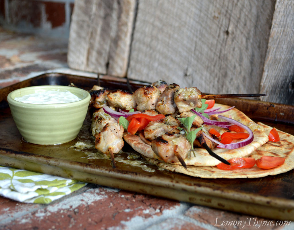 - Place pork souvlaki skewers over pita flat breads. Drizzle with reduced marinade. Sprinkle with thinly sliced red onion, diced tomato, fresh oregano. With a healthy side of Tzatziki Sauce.