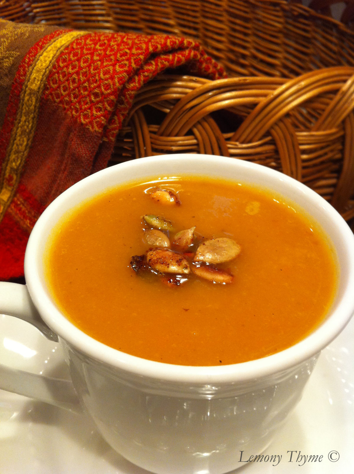Pumpkin Acorn Squash Soup with Cumin Toasted Pumpkin Seeds