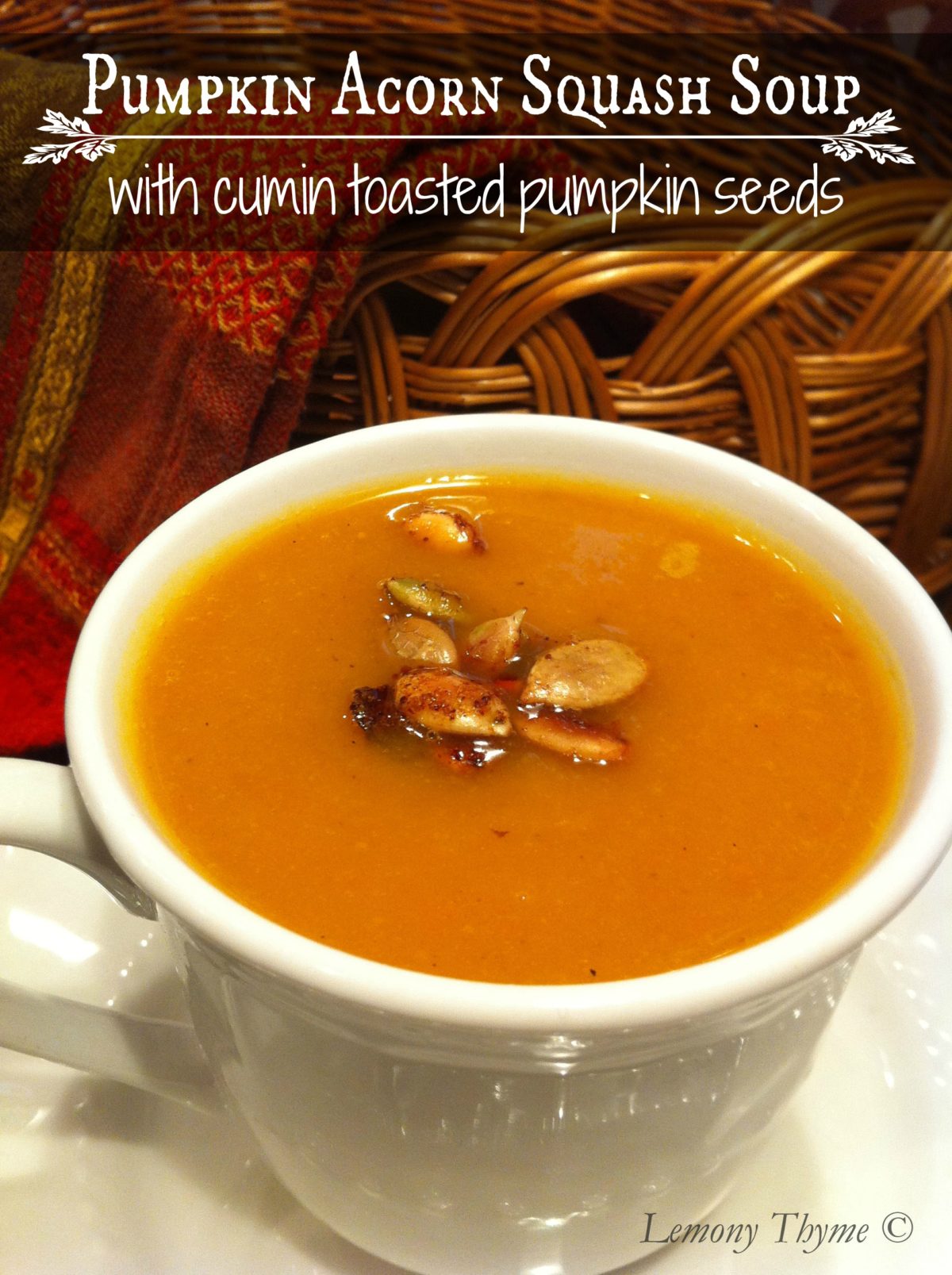 Pumpkin Acorn Squash Soup {with Cumin Toasted Pumpkin Seeds}