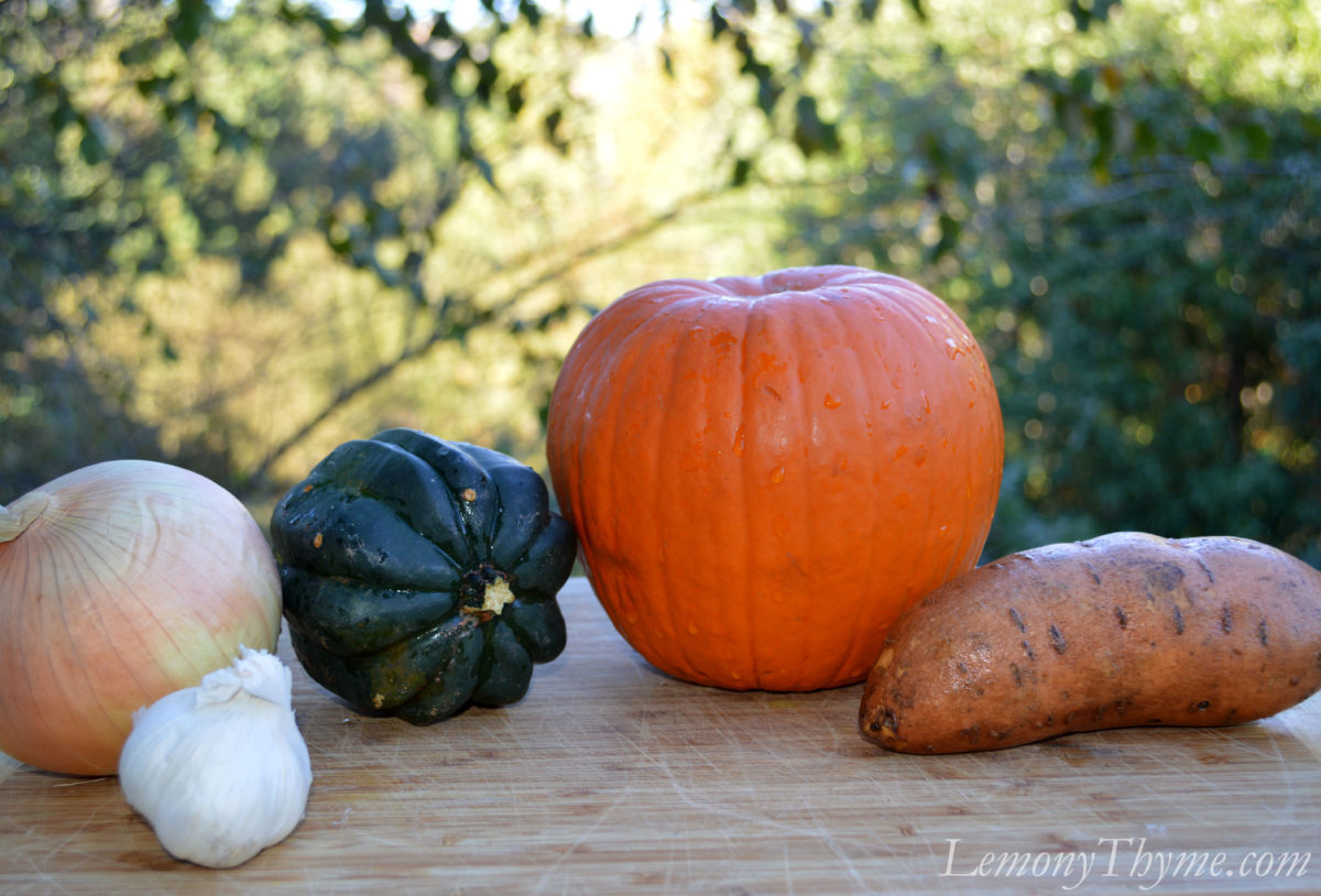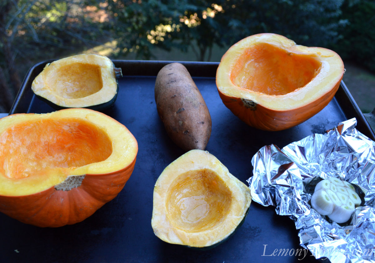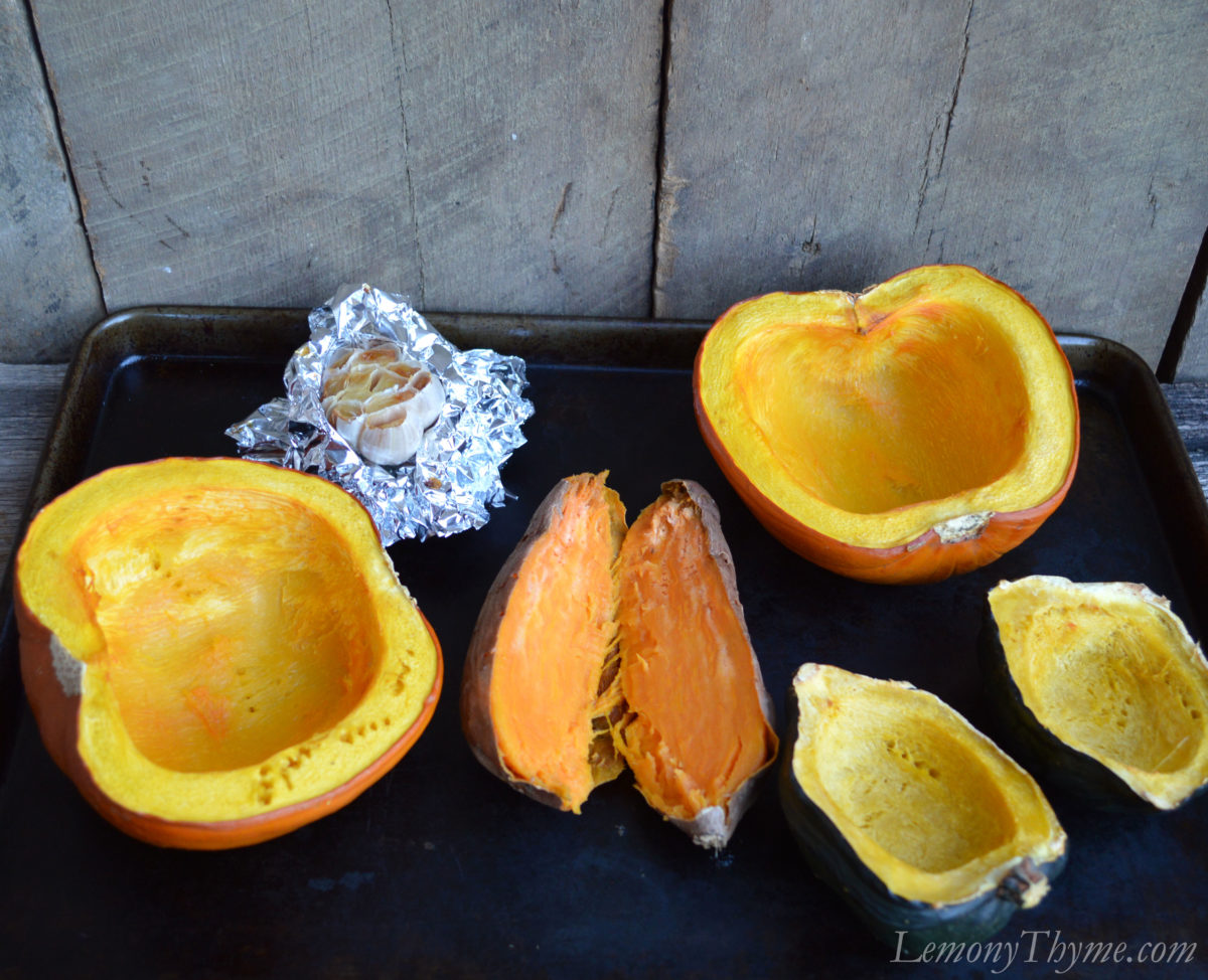 • Cut pumpkin and acorn squash in half, remove seeds (reserve pumpkin seeds); then rub insides with olive oil. Pierce sweet potato with fork several times. Cut top off head of garlic and drizzle with olive oil and wrap in foil. Place veggies and garlic on shallow rimmed baking sheet and roast for 45 – 50 minutes or until fork tender.