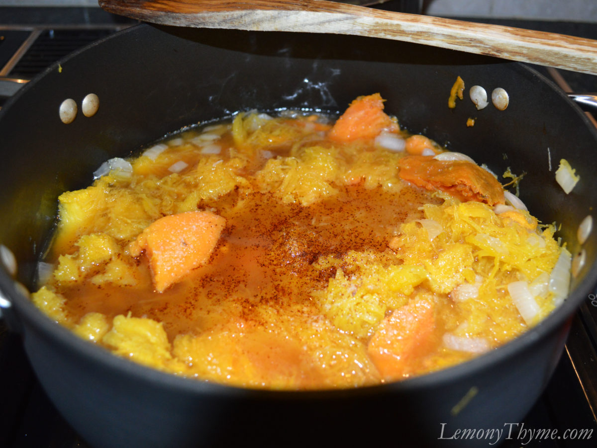 • Once done, remove roasted veggies from oven and allow to cool slightly. Using a fork or knife, scrape out the roasted flesh of the pumpkin, acorn squash, and sweet potato; add to the Dutch oven. Squeeze garlic head to remove roasted garlic; add to pot. Add broth, salt, pepper, nutmeg and cayenne pepper.