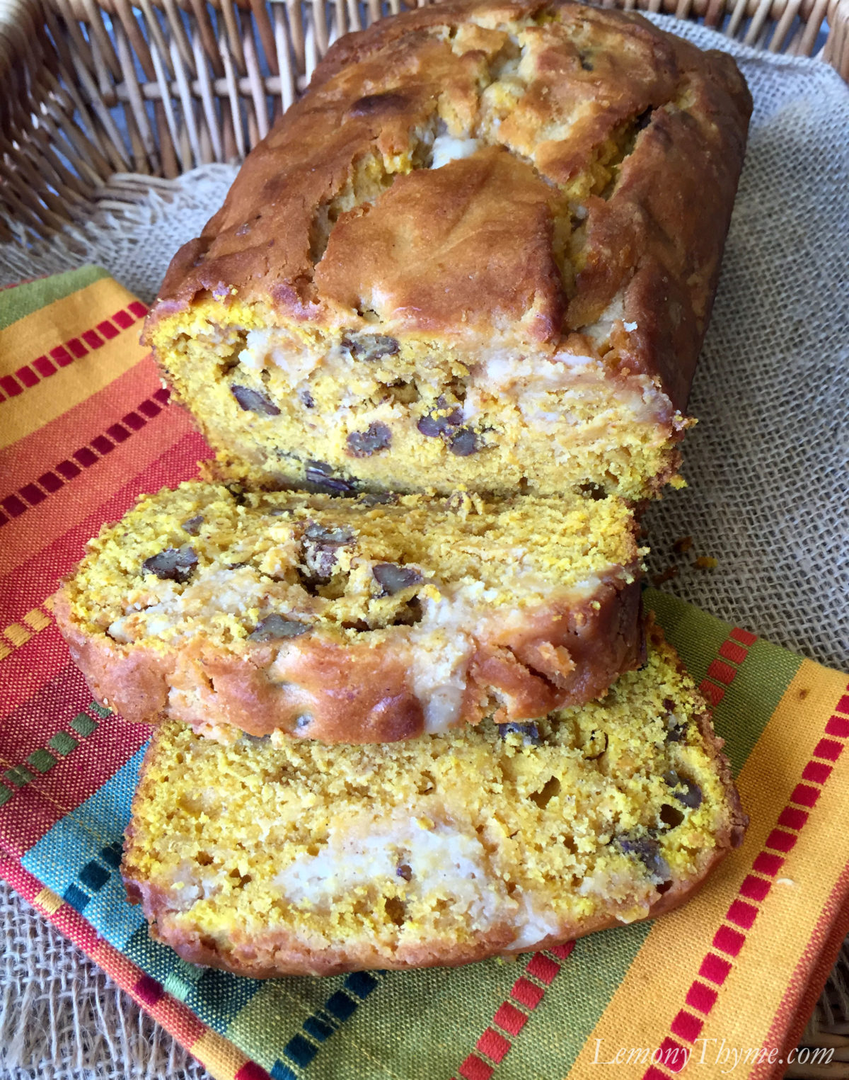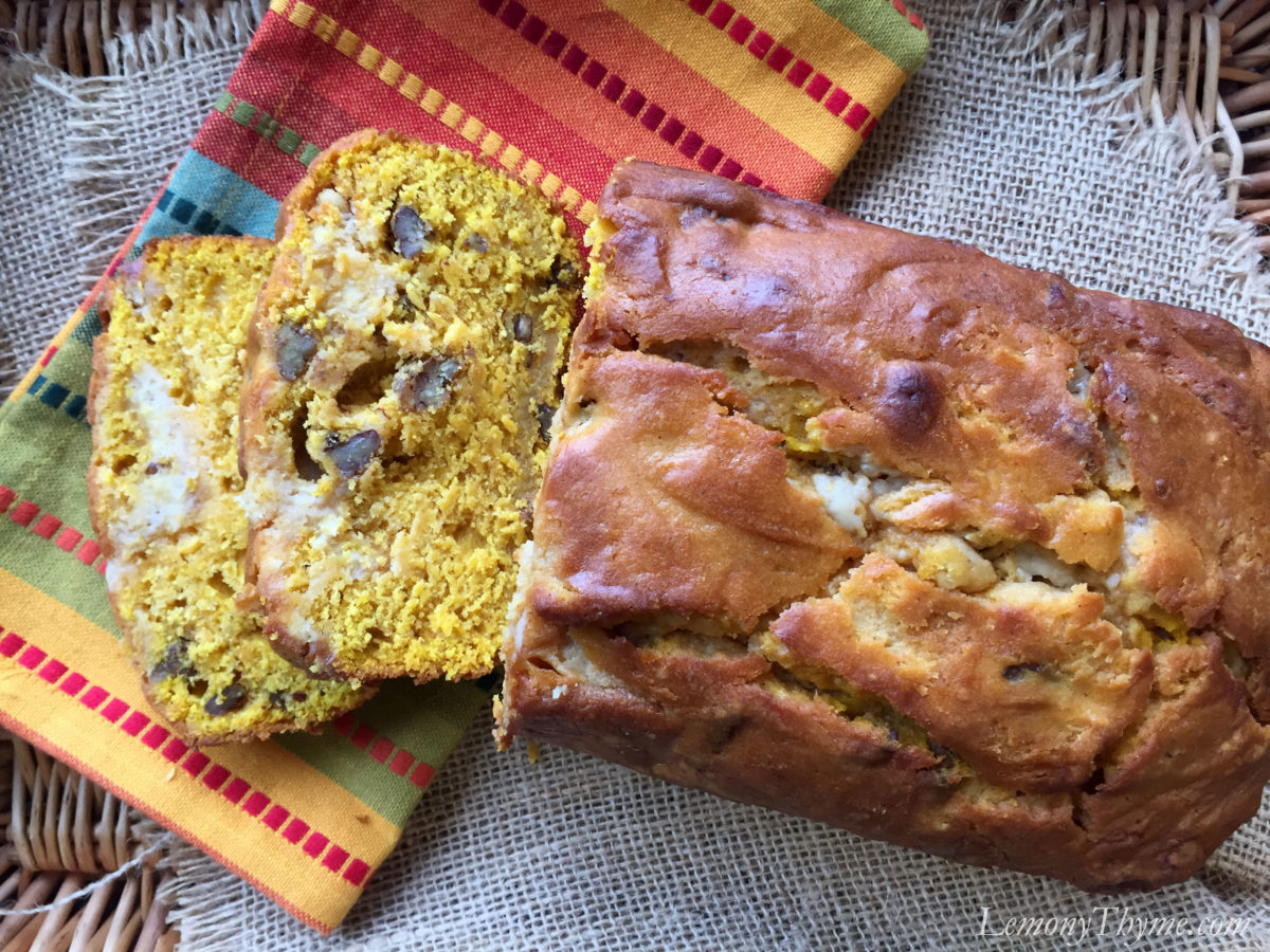 So about that failed attempt at a cream cheese swirl.  At the last minute I decided to add an ever popular twist.  With the batter already in my loaf pans, I softened 4 ounces of cream cheese and stirred in a 1/2 cup brown sugar.  Dolloped it on top and tried to swirl it into the batter.  I’m leaving that part out of the recipe below, although feel free to give it a go.
