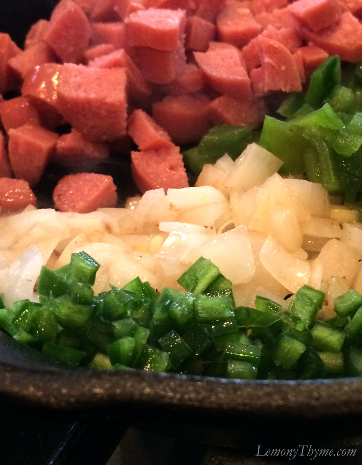 - Heat olive oil in medium cast iron skillet or other sauté pan over medium heat. Add diced poblano, onion and jalapenos. Sauté about 5 minutes; add in diced chorizo and cook another 5-10 minutes until onion is tender.