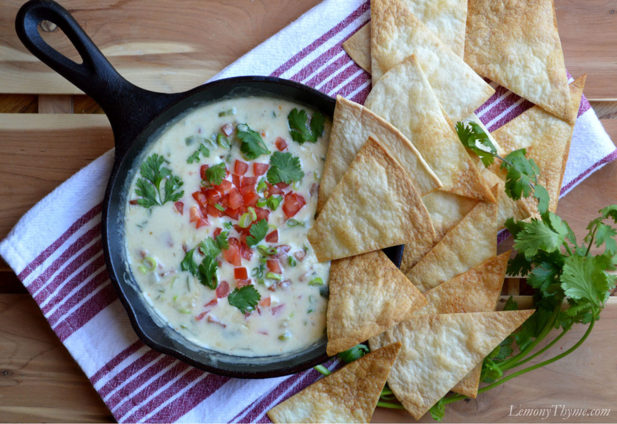 With the BIG Game Day approaching it was time for a new dip in the Lemony Thyme house. Queso Fundido with Fire Roasted Poblano Peppers sure did the trick.