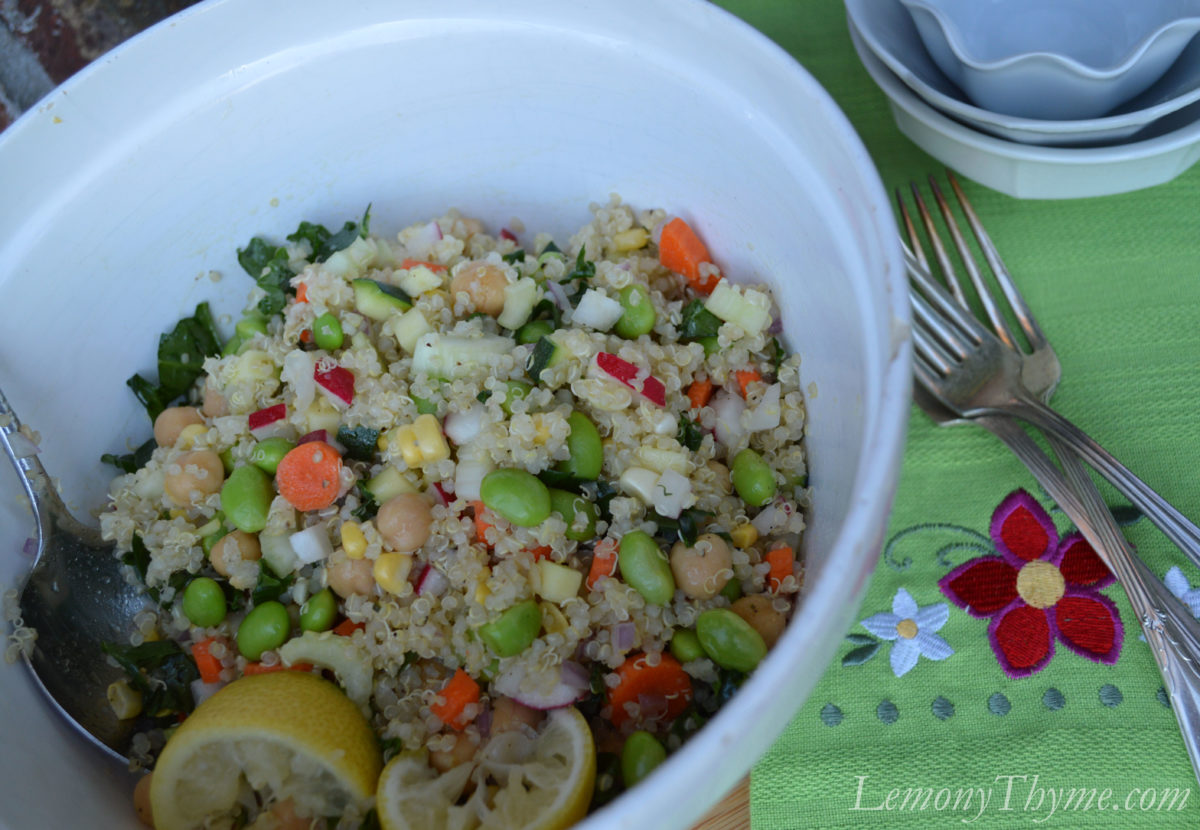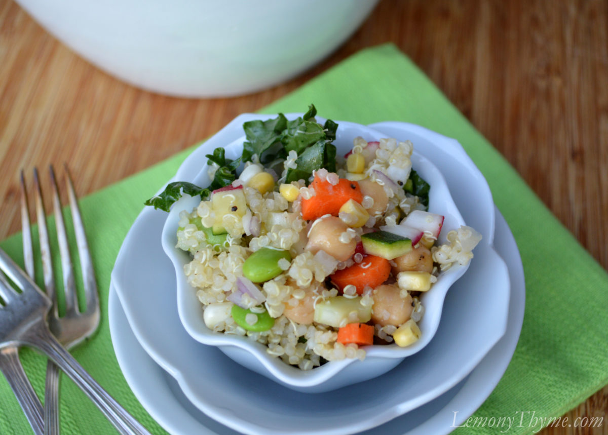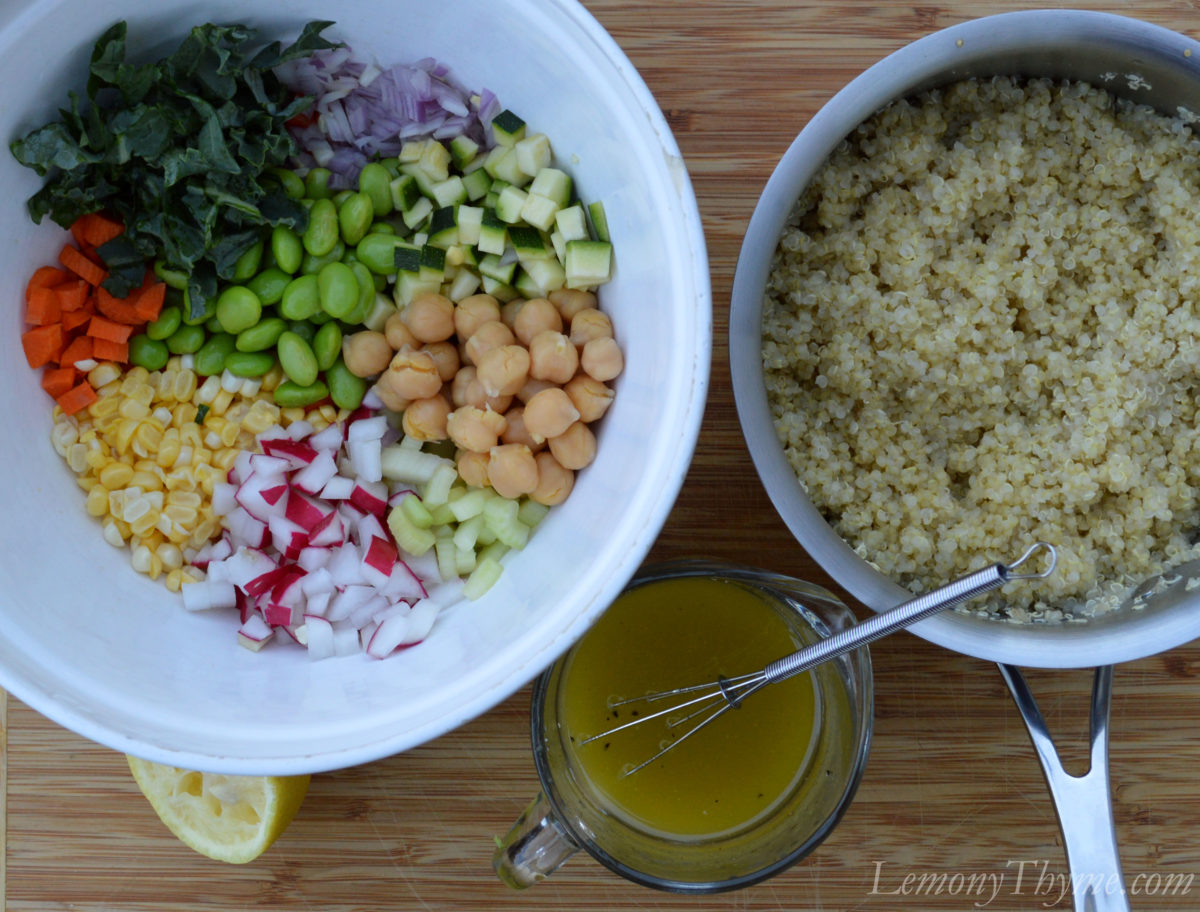The idea of this salad is to add a good variety veggie colors and textures to the cooked quinoa.  That’s what makes it so special…..that and the lovely lemon vinaigrette.