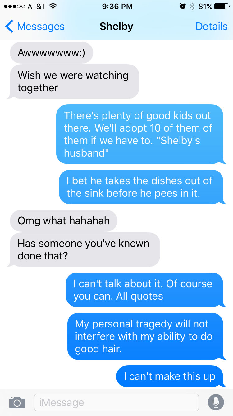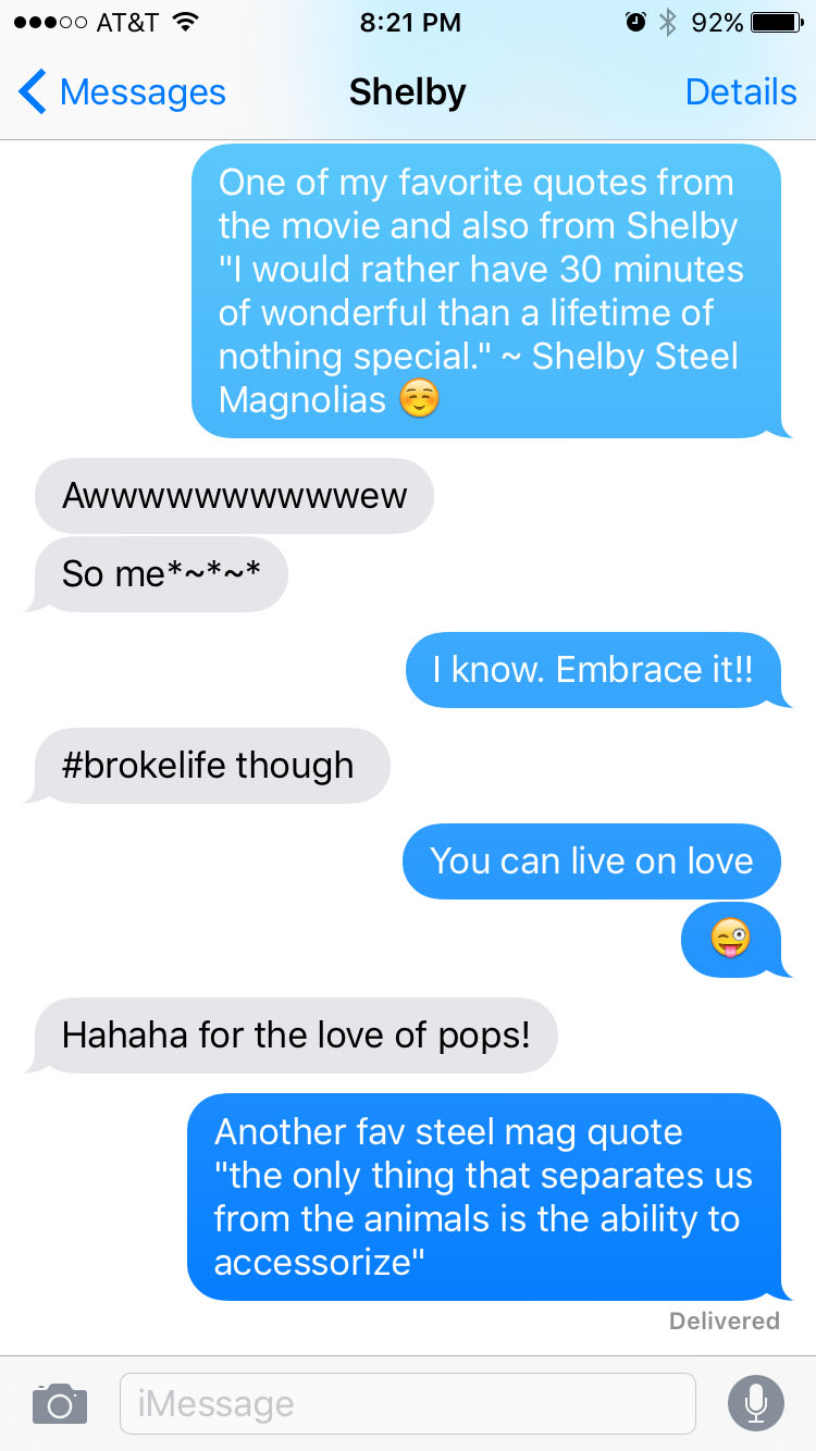 After all, I named my kid after the lead character, whether we had a boy or a girl, the name would be Shelby. A little Steel Magnolias text thread exchange with my Shelby.