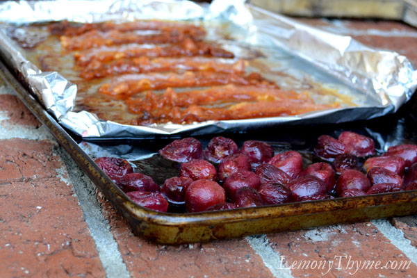 - Preheat oven to 400 degrees. Line a section of a shallow baking sheet with aluminum foil, turning up the sides to make an edge. Lay bacon slices on foil without overlapping. Place grapes on unlined section of sheet and drizzle with oil. Bake for 15 minutes or until bacon is browned and grapes begin to burst. Drain bacon on paper towels.