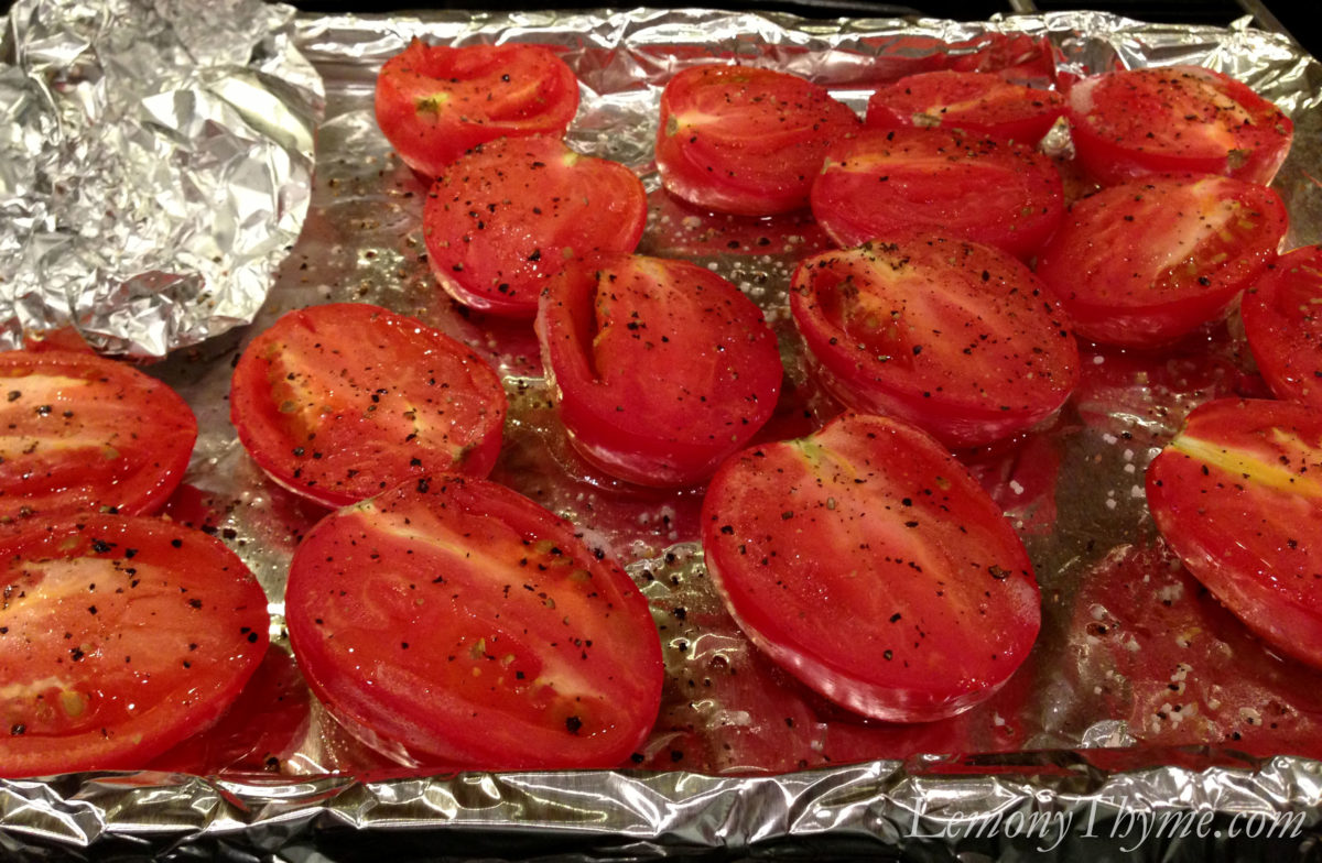 • Line baking pan with foil and coat with cooking spray. Arrange tomatoes cut side up on pan and drizzle with olive oil. Sprinkle with salt & pepper.