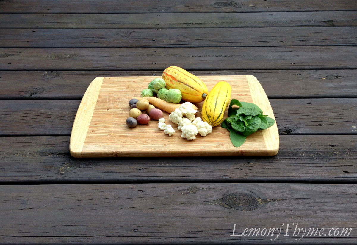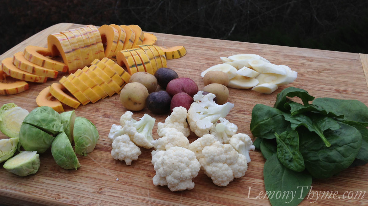 Just as Heidi’s recipe suggested I added other veggies we had on hand: Brussels sprouts, cauliflower, new potatoes, parsnip, and spinach. Anytime you can roast your vegetables before adding them to a dish means you have just insured yourself a wonderful flavor boost. And roasting is a great time to try something new. These delicata squash were a first for us and as suggested we roasted them with their skins on, making them super easy to work with. They have a wonderful winter squash flavor, a cross between an acorn and butternut squash.