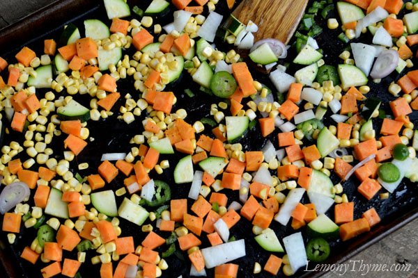 • Dice vegetables according to required cooking time. For example, sweet potato should be cut smaller than zucchini since they require longer cooking time. Toss veggies with olive oil, salt, pepper and any additional herbs or seasonings. Spread in a single layer on a shallow baking sheet.