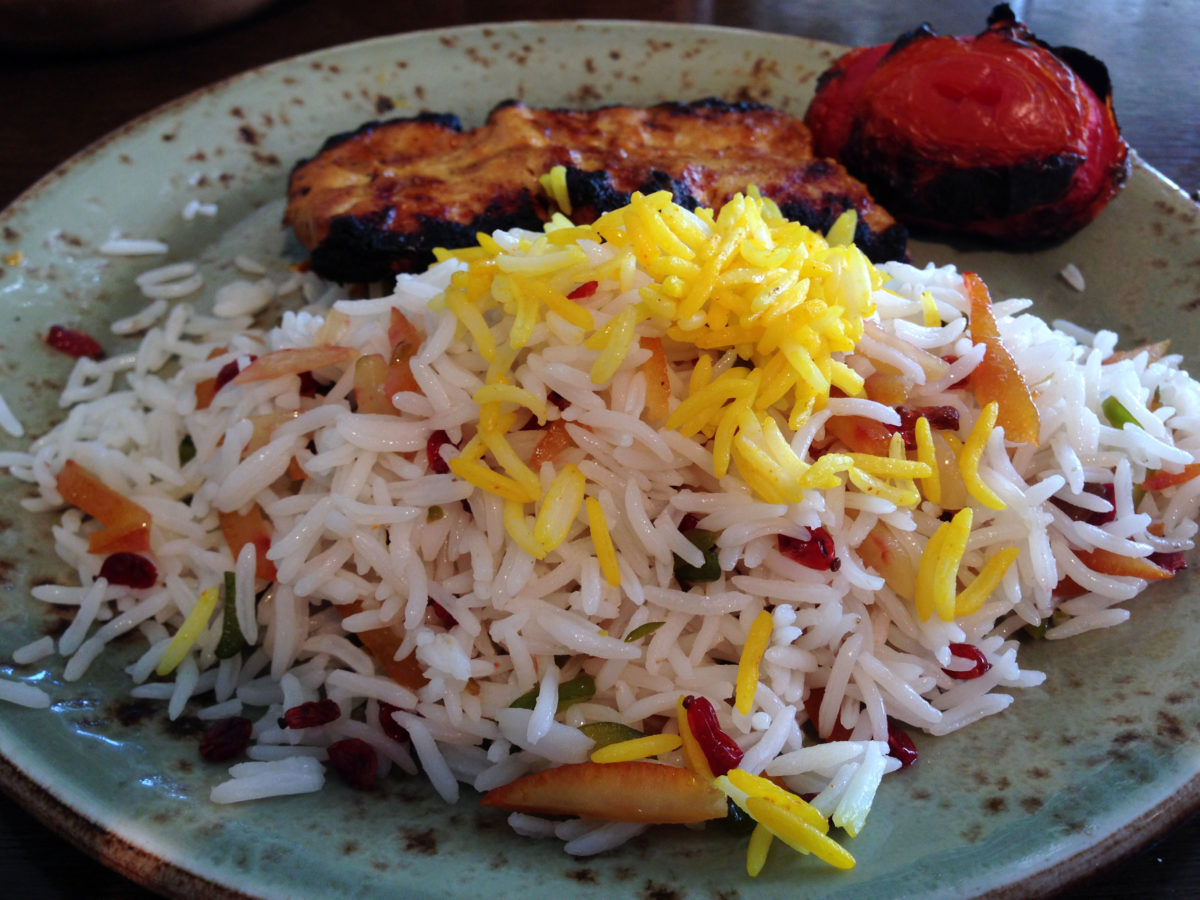 We could have been quite happy nibbling on all of these gorgeous appetizers, yet wanted to try one more authentic Persian dish. Shelby asked Paniz to choose her favorite chicken kabob, she selected Chicken Barg, seasoned with saffron. And also recommended their special rice which sounded amazing. And (yes, I just began two sentences in a row with ‘And’) she gladly offered to split the entrée and presented us each with picture perfect plates. Behold the beauty that is Persian Jeweled Rice.