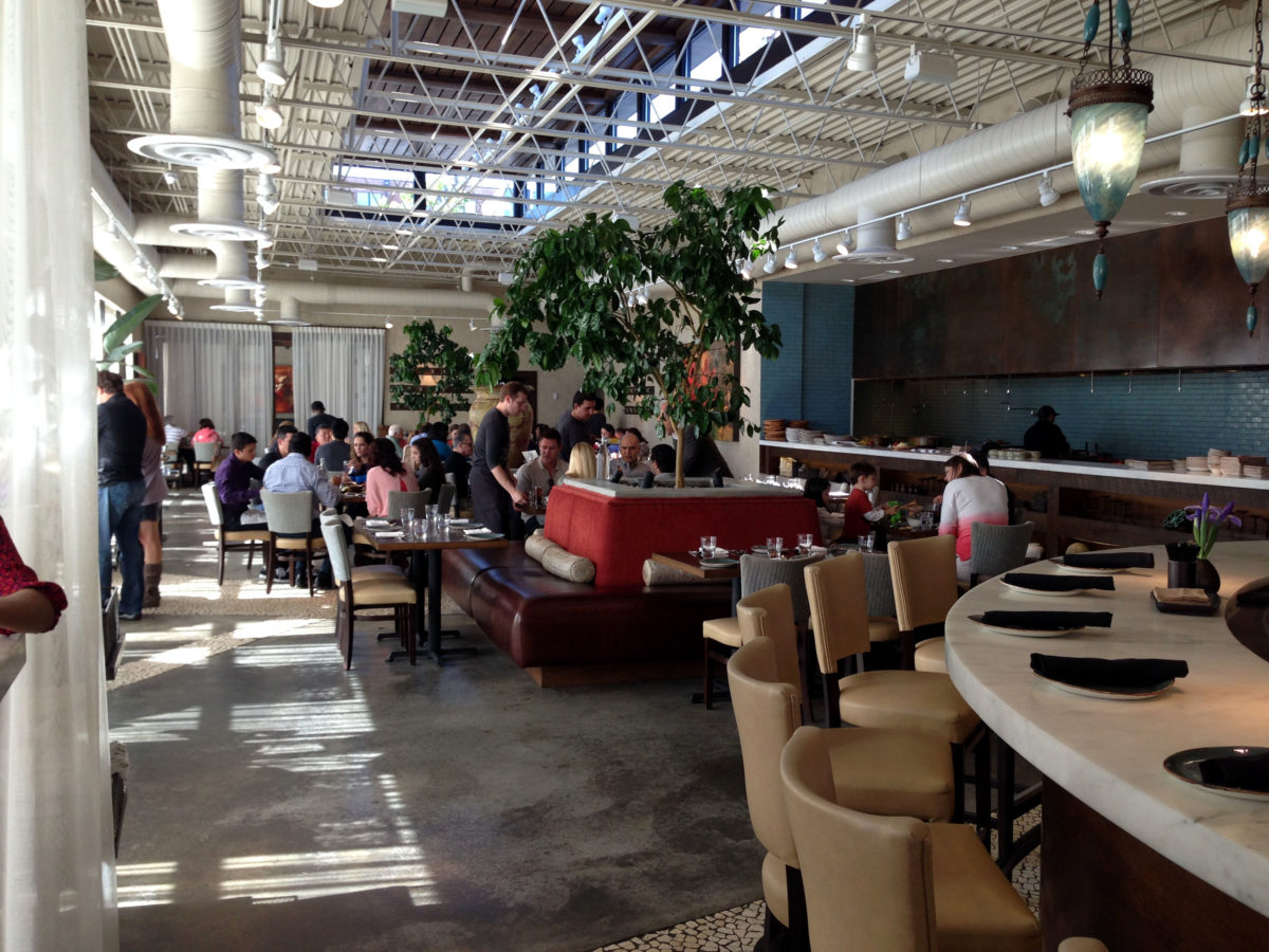 We went for the food, but the ambiance grabbed our attention the minute we walked through the oversized front door. The best way to describe the interior is open. Open floor plan, open kitchen, open ceiling (converted warehouse feel, with natural light at the roof top). Shades of grays and blues, stone and concrete, stacks of stoneware plates and bowls of every size. I’m such a tourist in my own city, snapping pictures left and right.