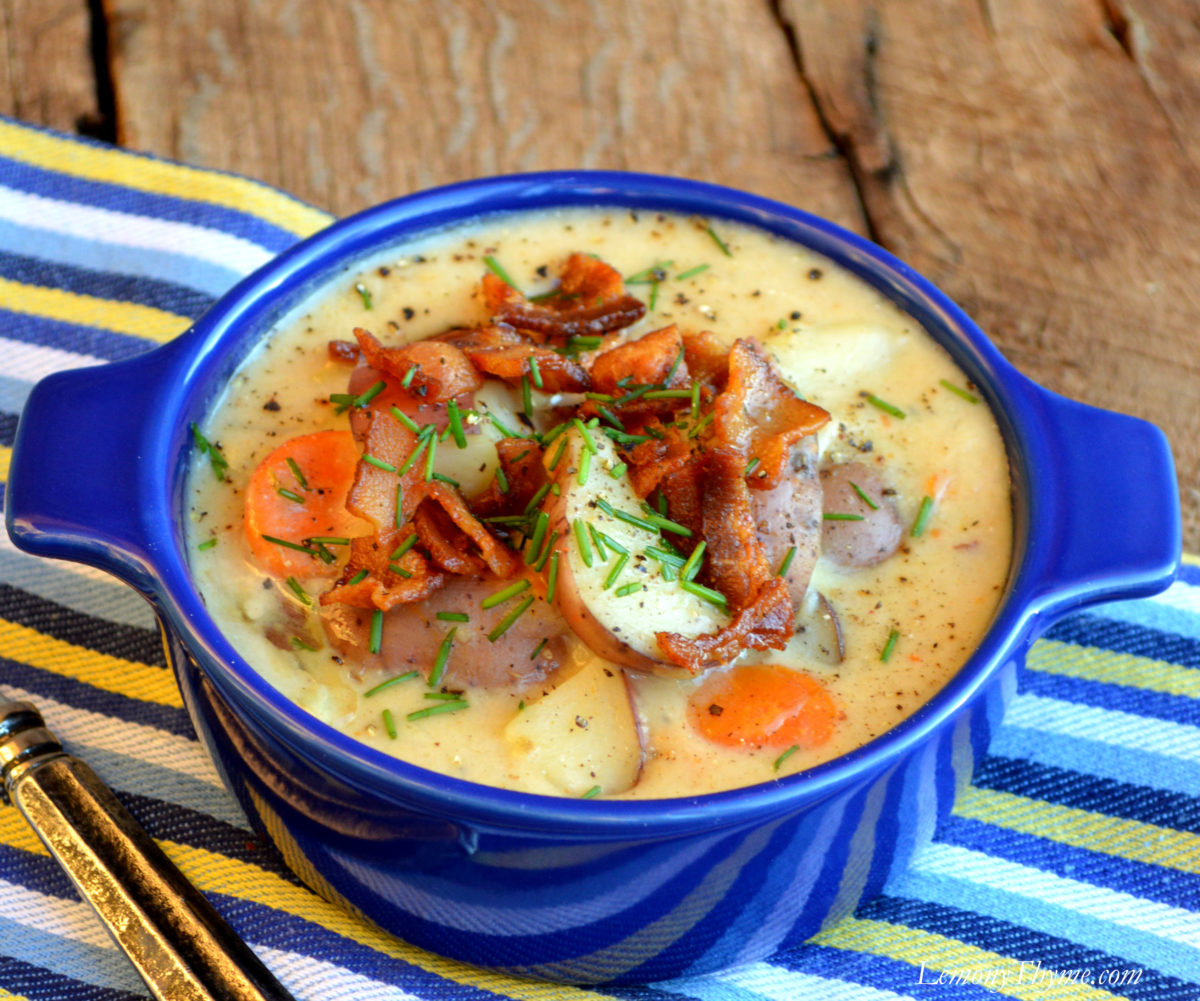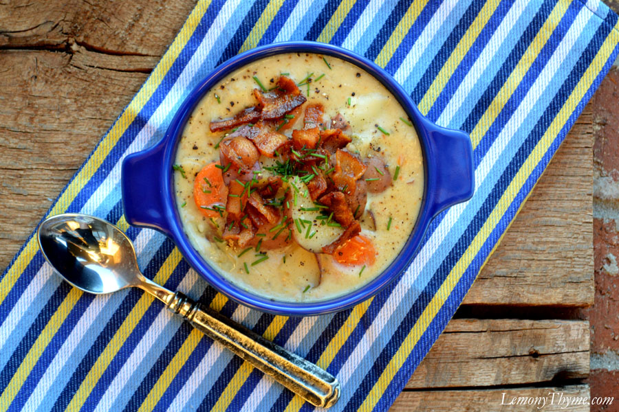 Rustic Potato Chowder with Bacon. After one bite I knew we would have to recreate it for Lemony Thyme. It’s hearty enough to enjoy as a meal and easy enough to become a weeknight favorite.