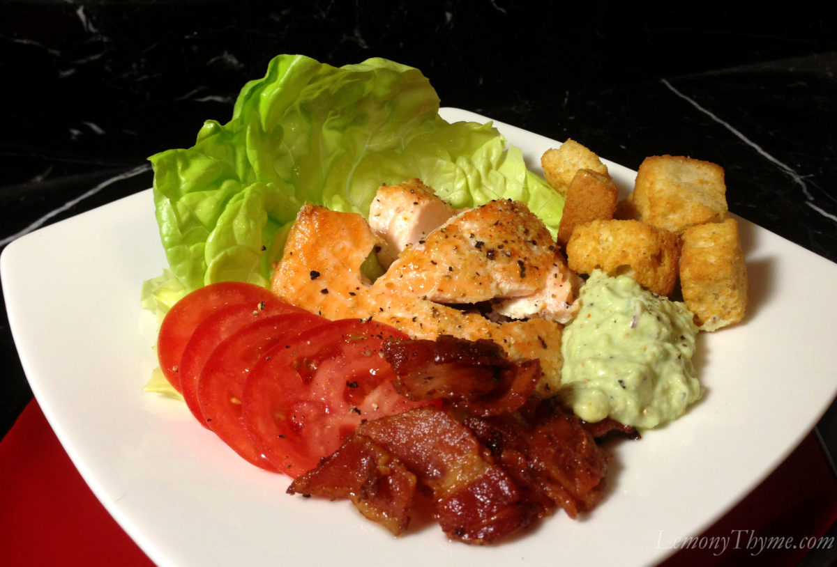 I realize that a Salmon BLT Salad with Avocado Aioli is not much of a recipe.  And possibly not worthy of a post.  However, it was really good.  And the fact that it was very basic, down to packaged croutons…made it about the best thing we had eaten in at least 3 days.