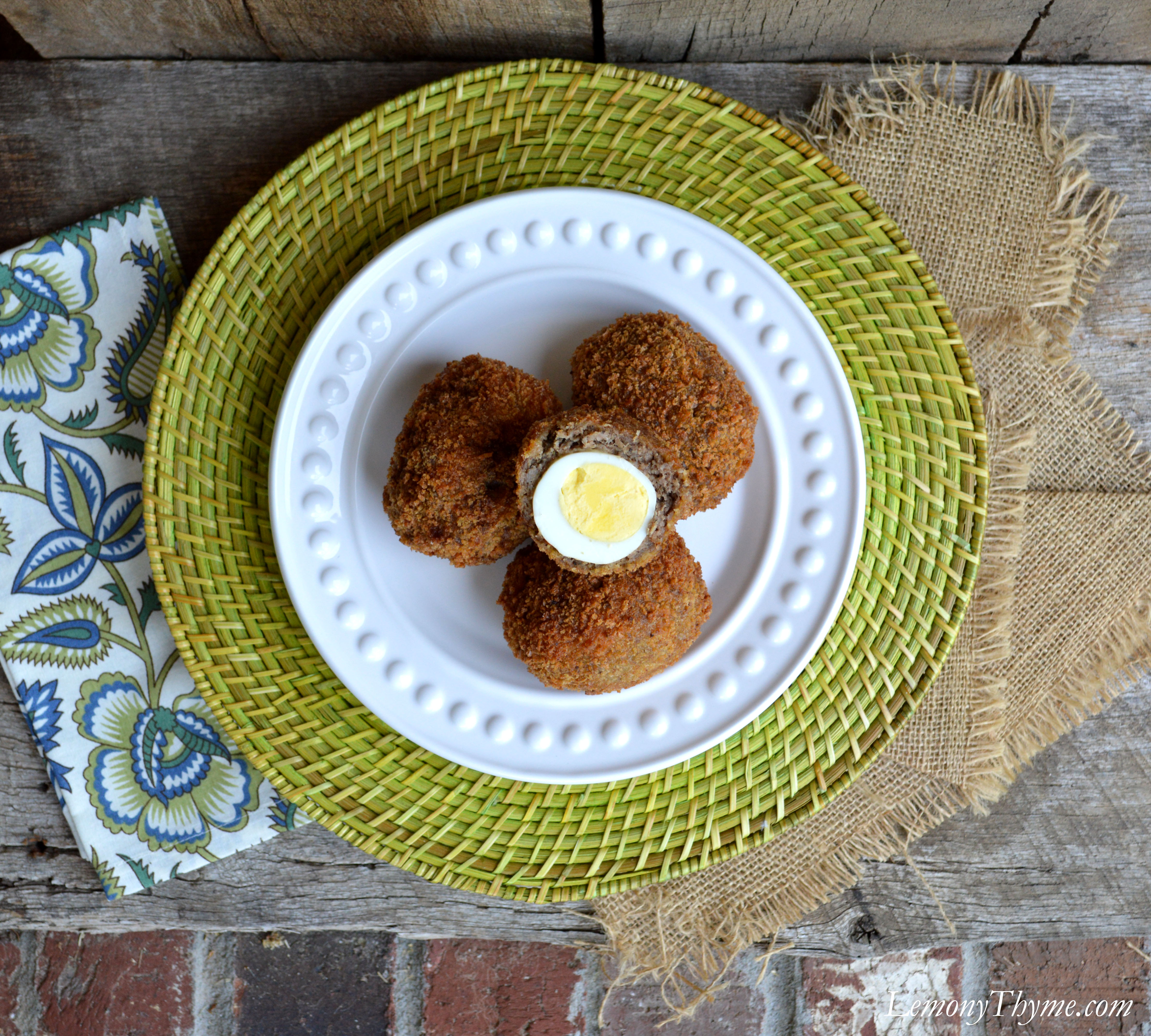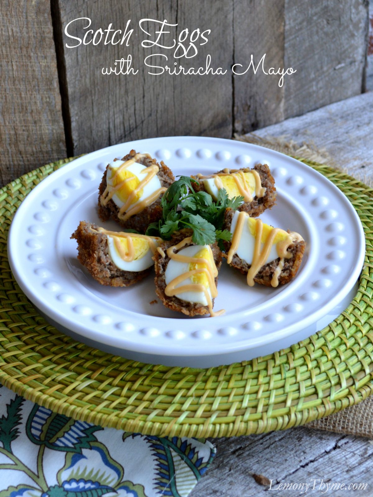 Scotch Eggs with Sriracha Mayo | LemonyThyme.com