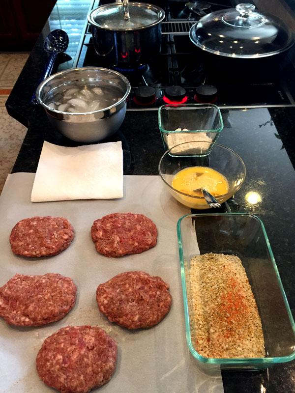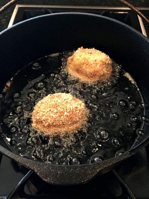 I chose a pound of hot breakfast sausage to encase our lightly floured soft-boiled eggs (3-4 minute boil, carefully peeled). Then into a classic 3-part breading; flour, egg, seasoned crumbs before a plunge in the fryer.